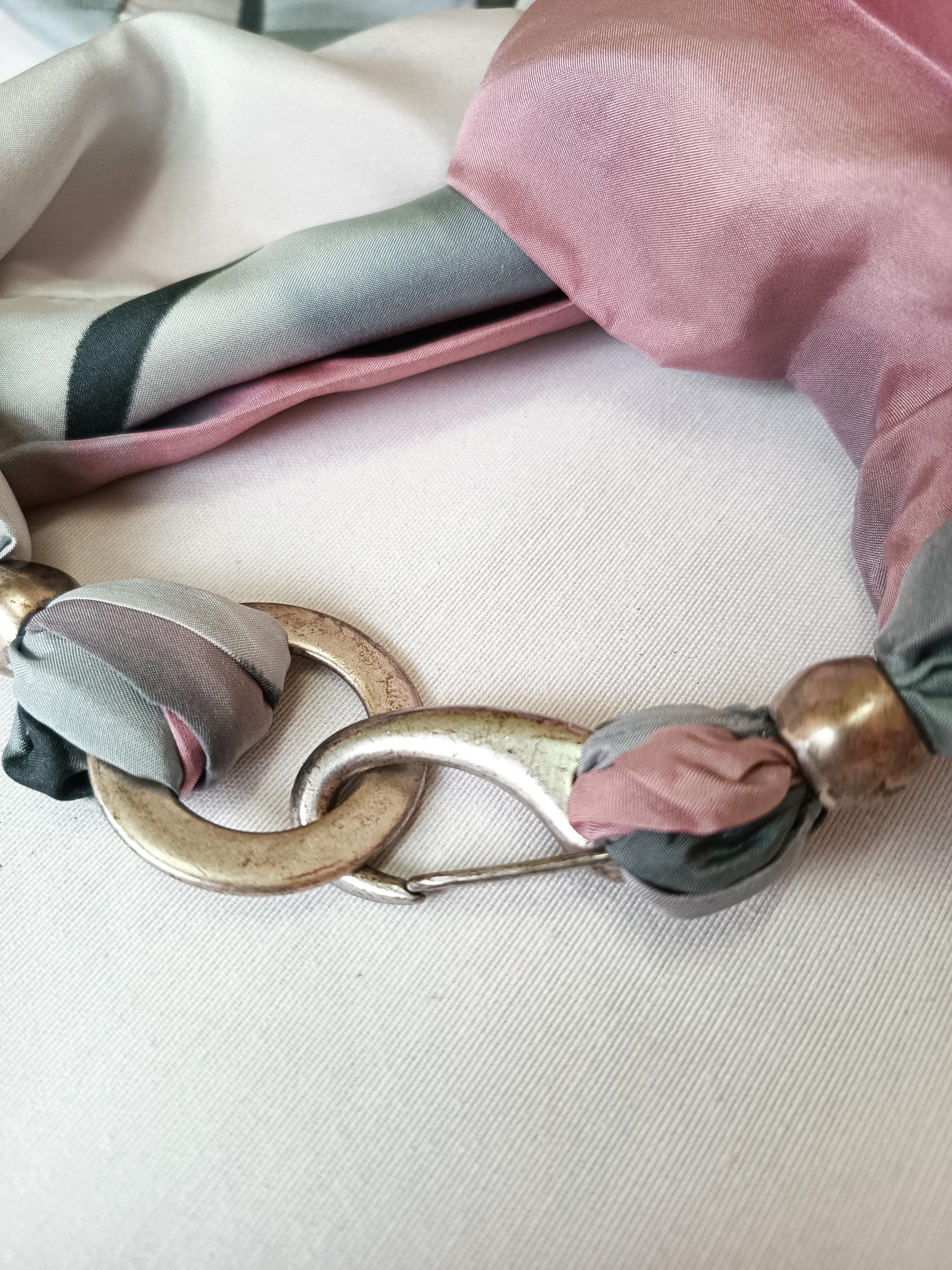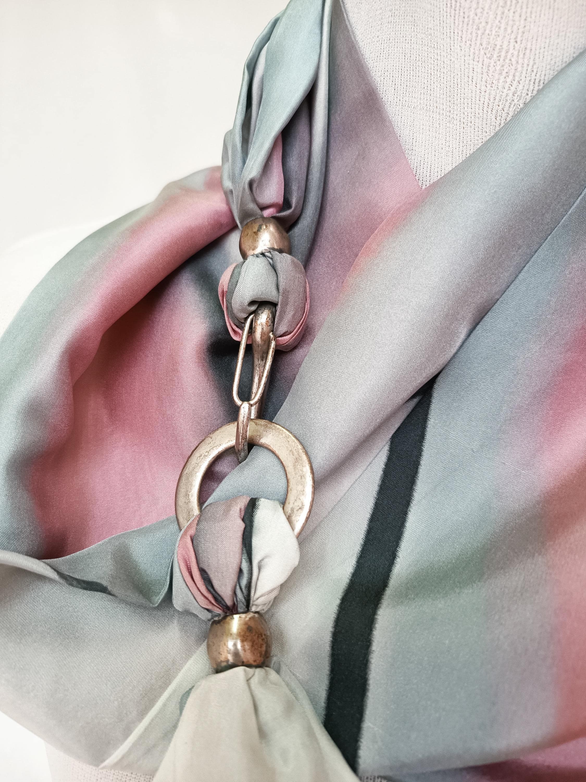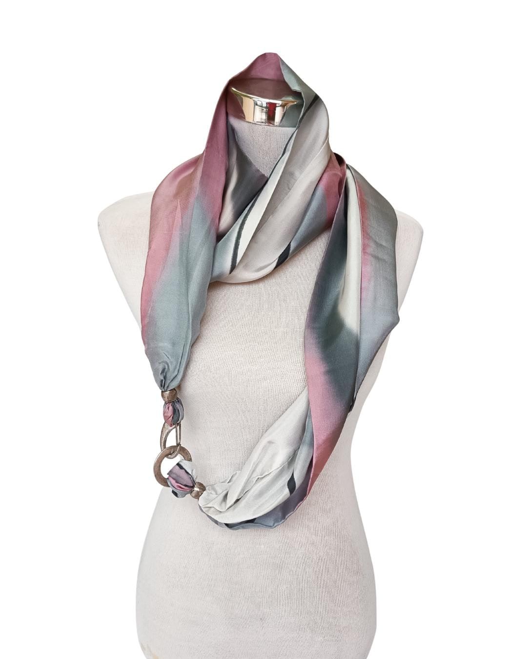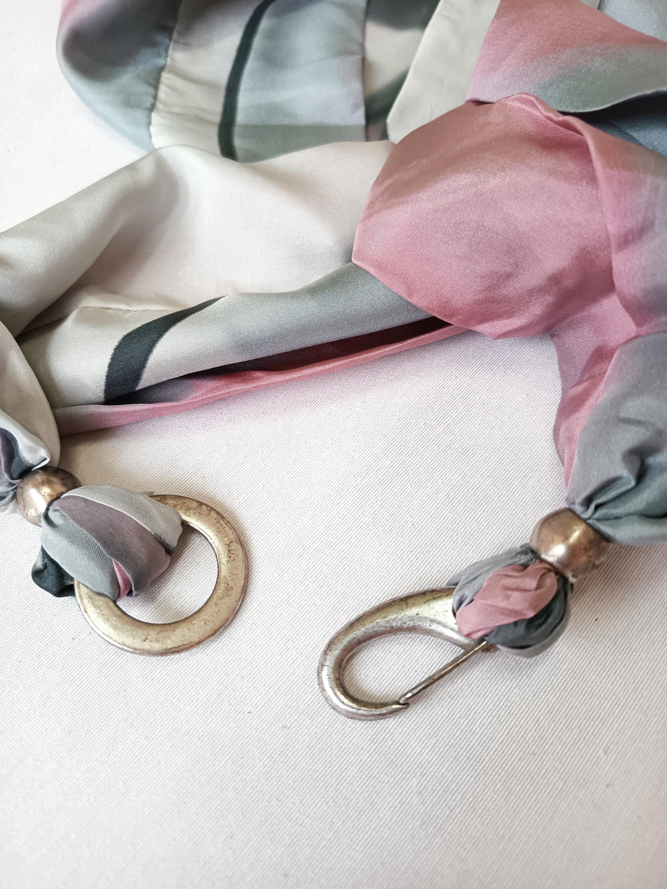 Pañuelo de seda Habotai pintado a mano, rosa, gris y blanco, cierre de broche.