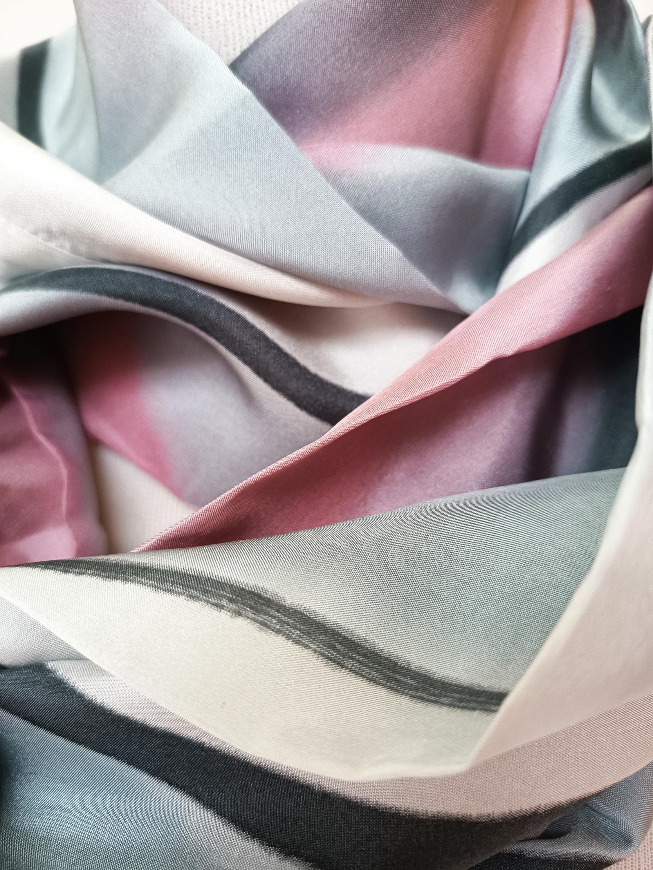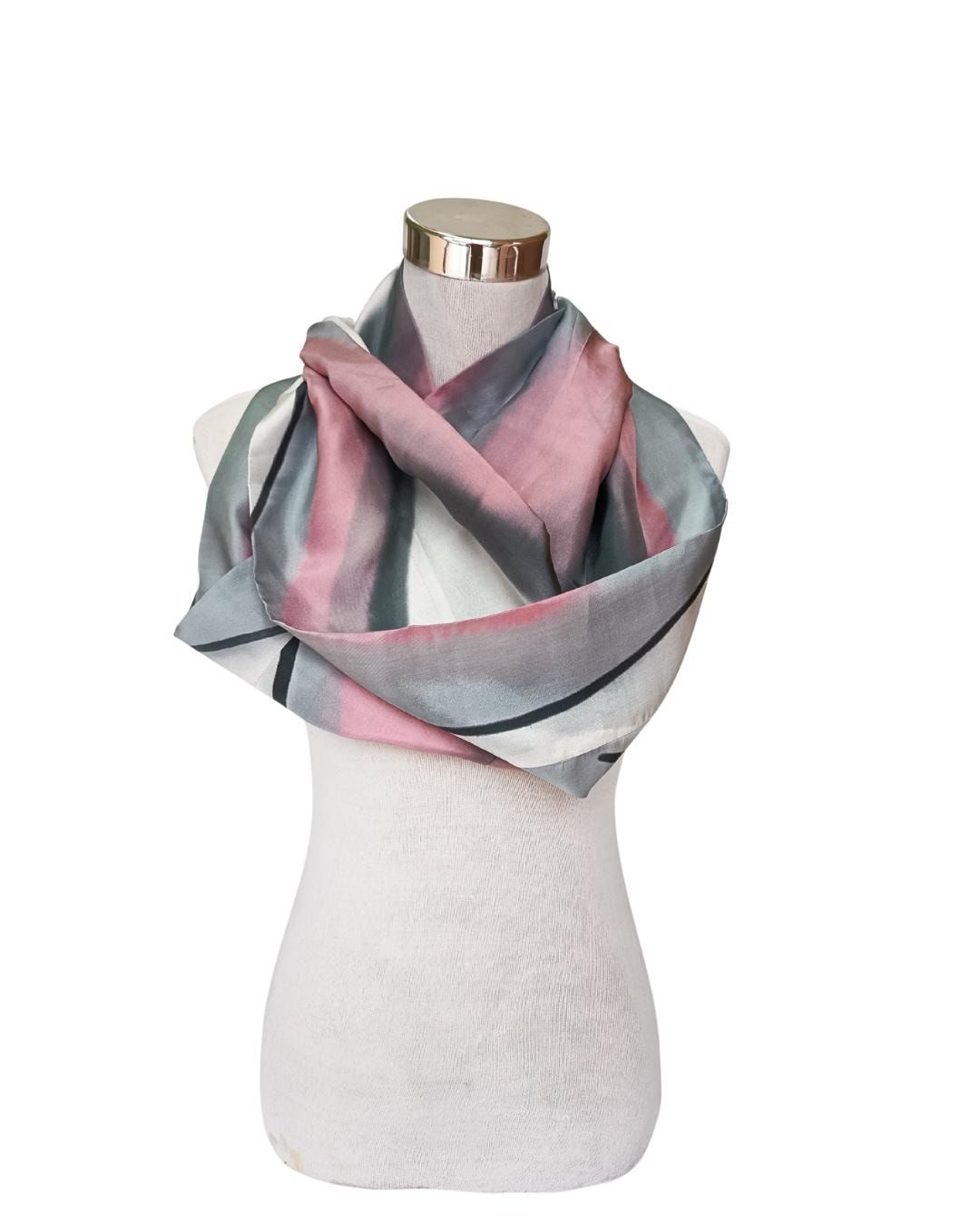 El diseño combina suaves tonos rosa empolvado con detalles en gris y carbón, creando una composición artística y sofisticada. Cada bufanda está pintada a mano individualmente, lo que garantiza que no haya dos piezas exactamente iguales.