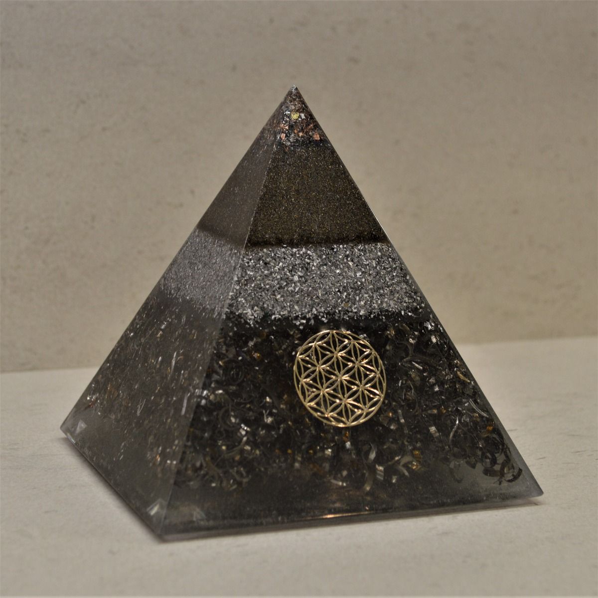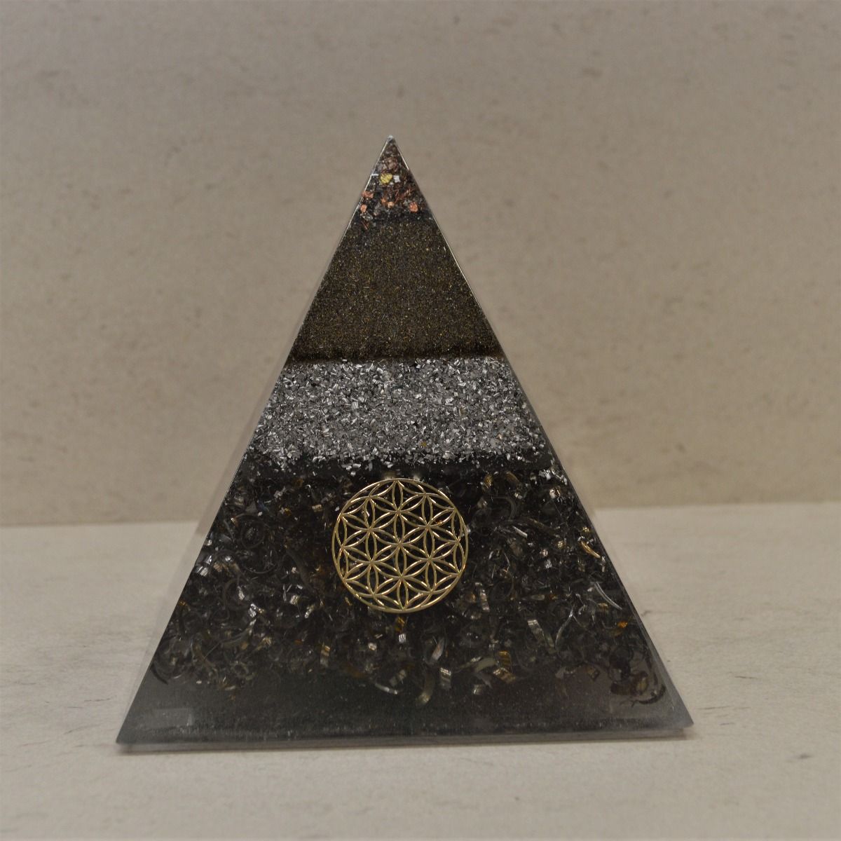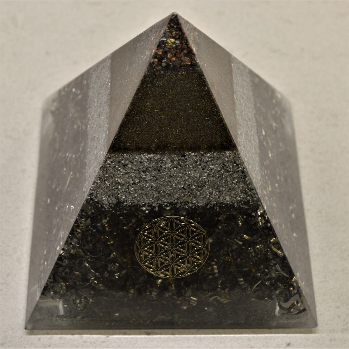 Pirámide orgonita ultraprotectora. Está compuesta de resina de poliéster con virutas de metal (aluminio, hierro, latón, acero, cobre) en una proporción al 50%, y en su interior un cuarzo, chips de cuarzo recogidos en la montaña del Montseny y ceniza de madera.