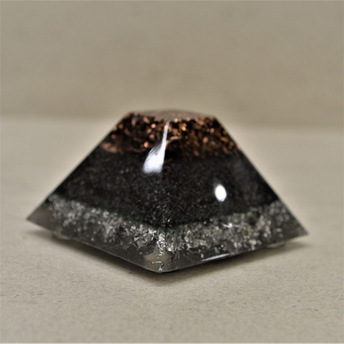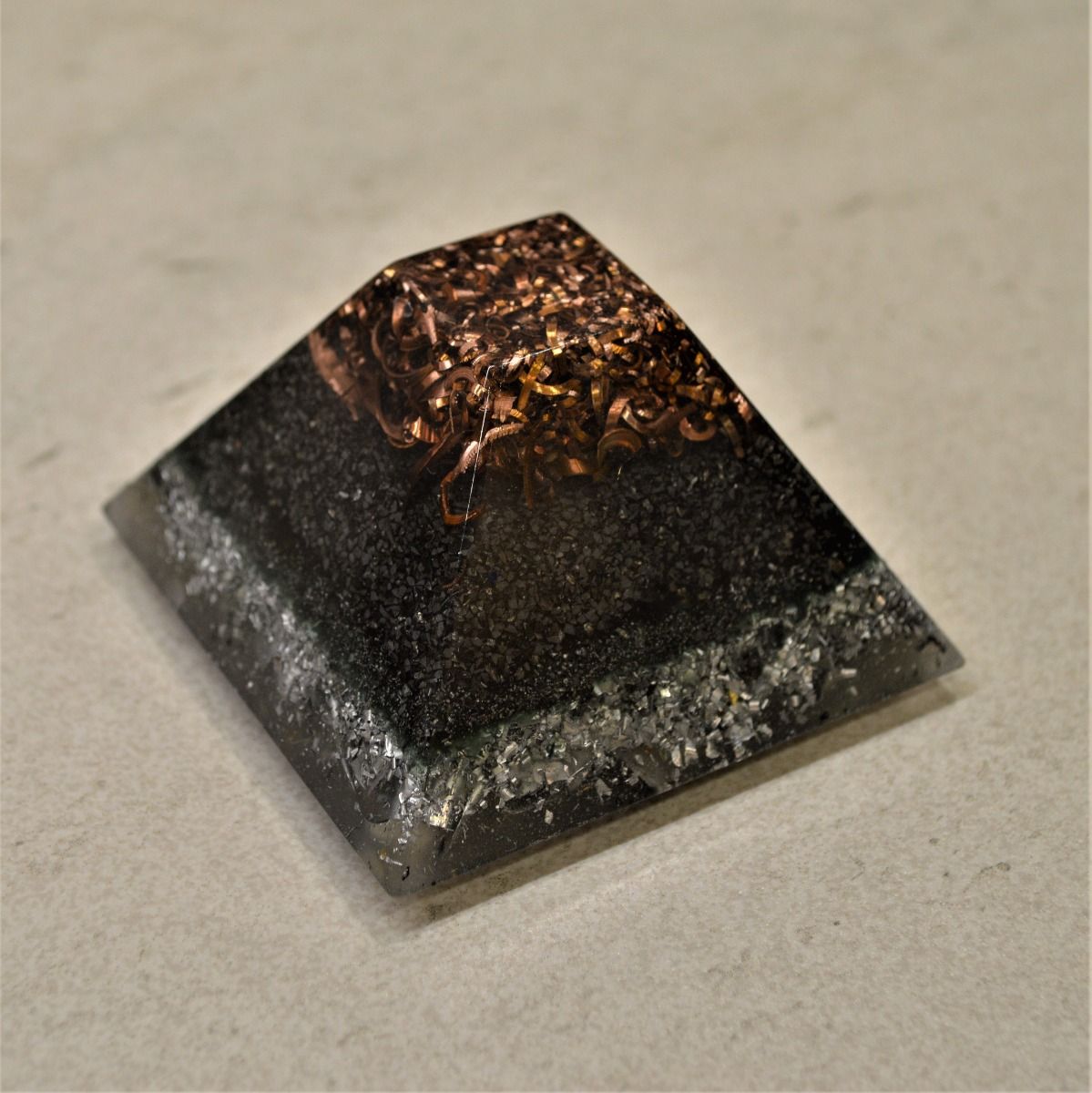 La composición de esta pirámide-orgonita, es resina de poliéster con virutas de metal (aluminio, hierro, bronce, cobre) en una proporción al 50%, y en su interior un cuarzo recogido en la montaña del Montseny, activados durante 3 noches a la luz de la luna llena y programados debidamente.