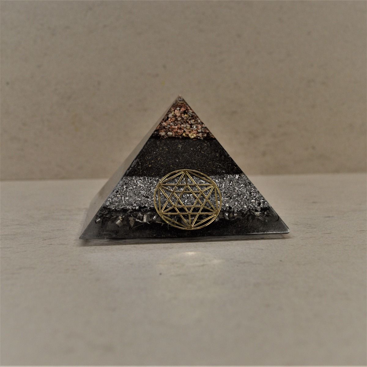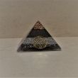 Pirámide orgonita ultraprotectora mediana. Está compuesta de resina de poliéster con virutas de metal (aluminio, hierro, latón, acero, cobre) en una proporción al 50%, y en su interior un cuarzo, chips de cuarzo recogidos en la montaña del Montseny, ceniza de madera y shungita.