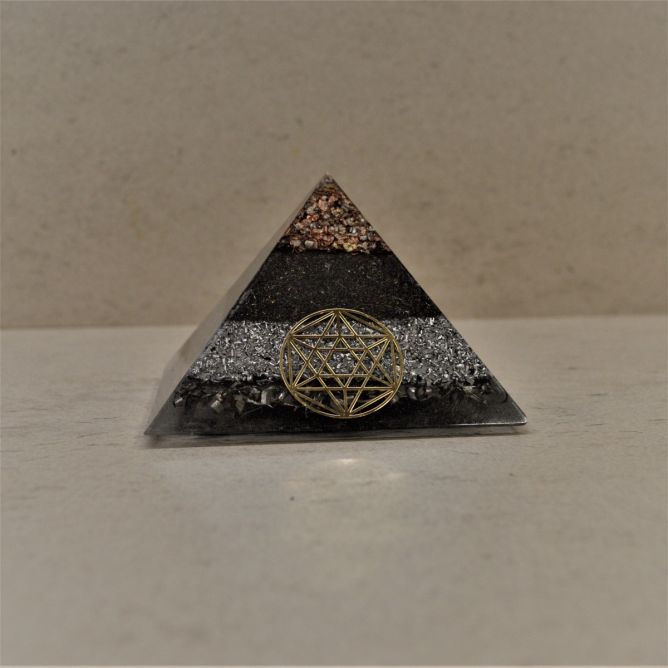 La composición de esta pirámide-orgonita, es resina de poliéster con virutas de metal (aluminio, hierro, latón, acero, cobre) en una proporción al 50%, y en su interior un cuarzo y chips de cuarzo recogidos en la montaña del Montseny, activados durante 3 noches a la luz de la luna llena y programados debidamente. También incluye ceniza de madera y shungita.