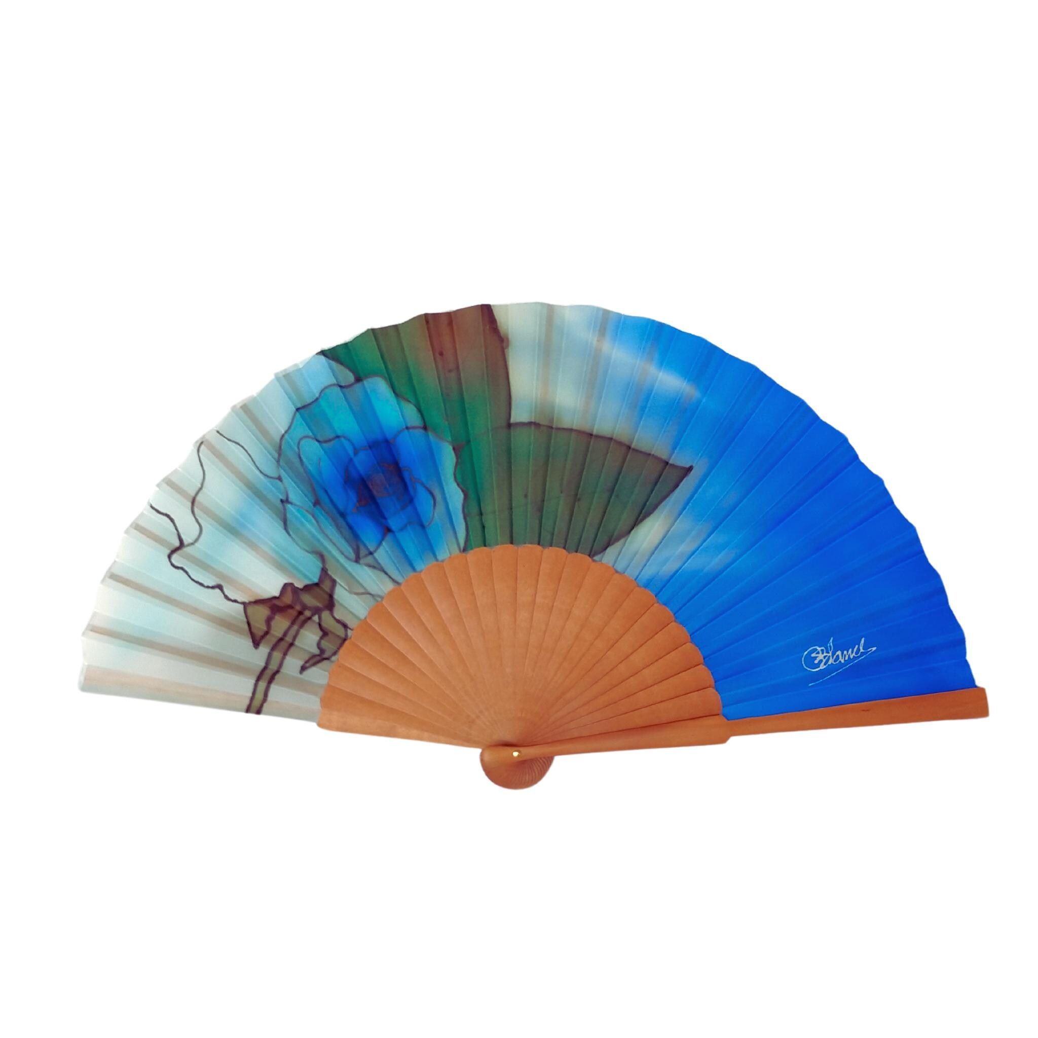 Abanico de seda azul pintado a mano: elegante abanico plegable español con motivos florales