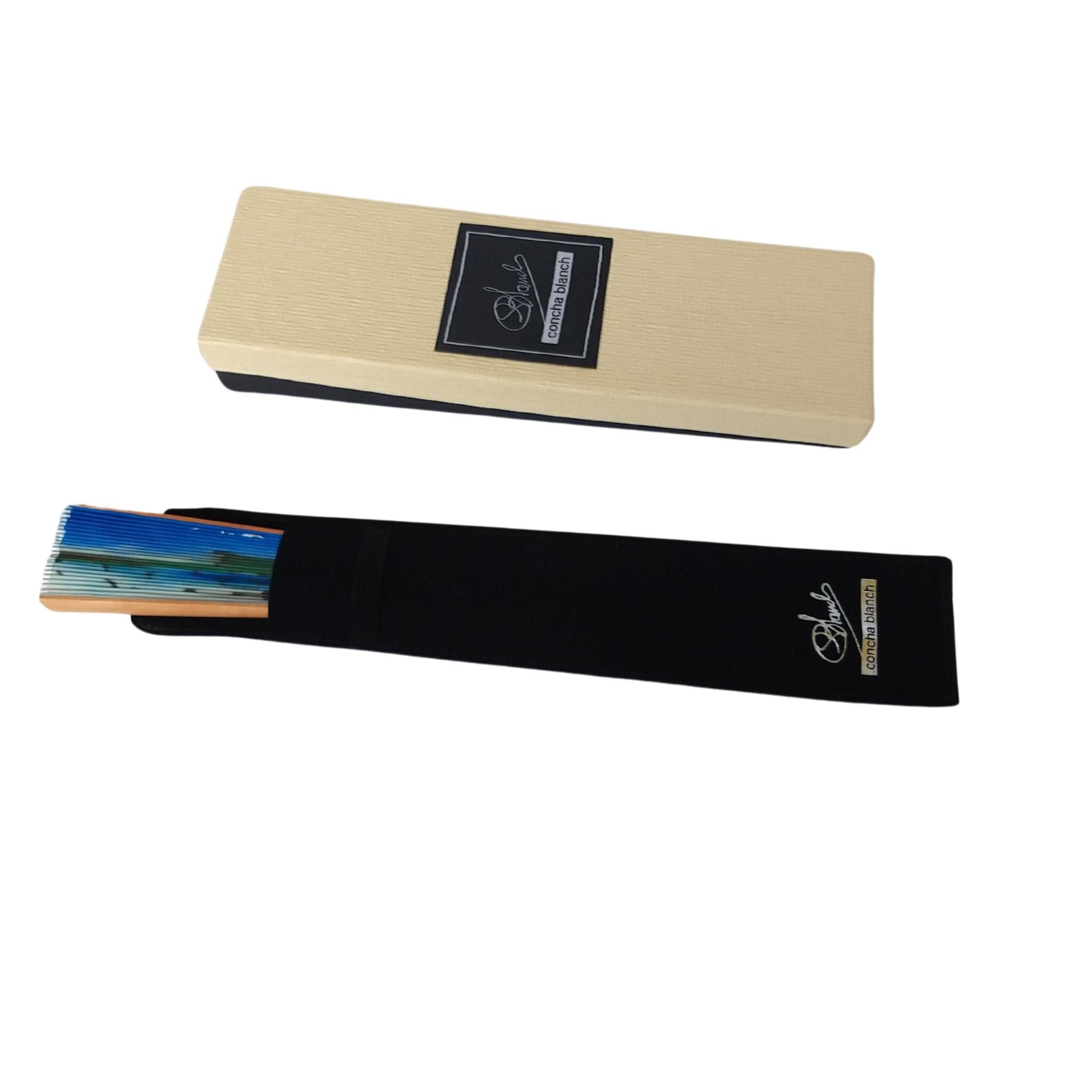 | Materiais | Elegancia Serena – Abanico de Seda Azul Pintado a Mano con Diseño Floral y DegradadoEste exquisito abanico plegable de seda luce un impresionante fondo azul degradado con una rosa azul delicadamente pintada a mano y exuberantes hojas verdes. Inspirado en la tranquilidad de la naturaleza |