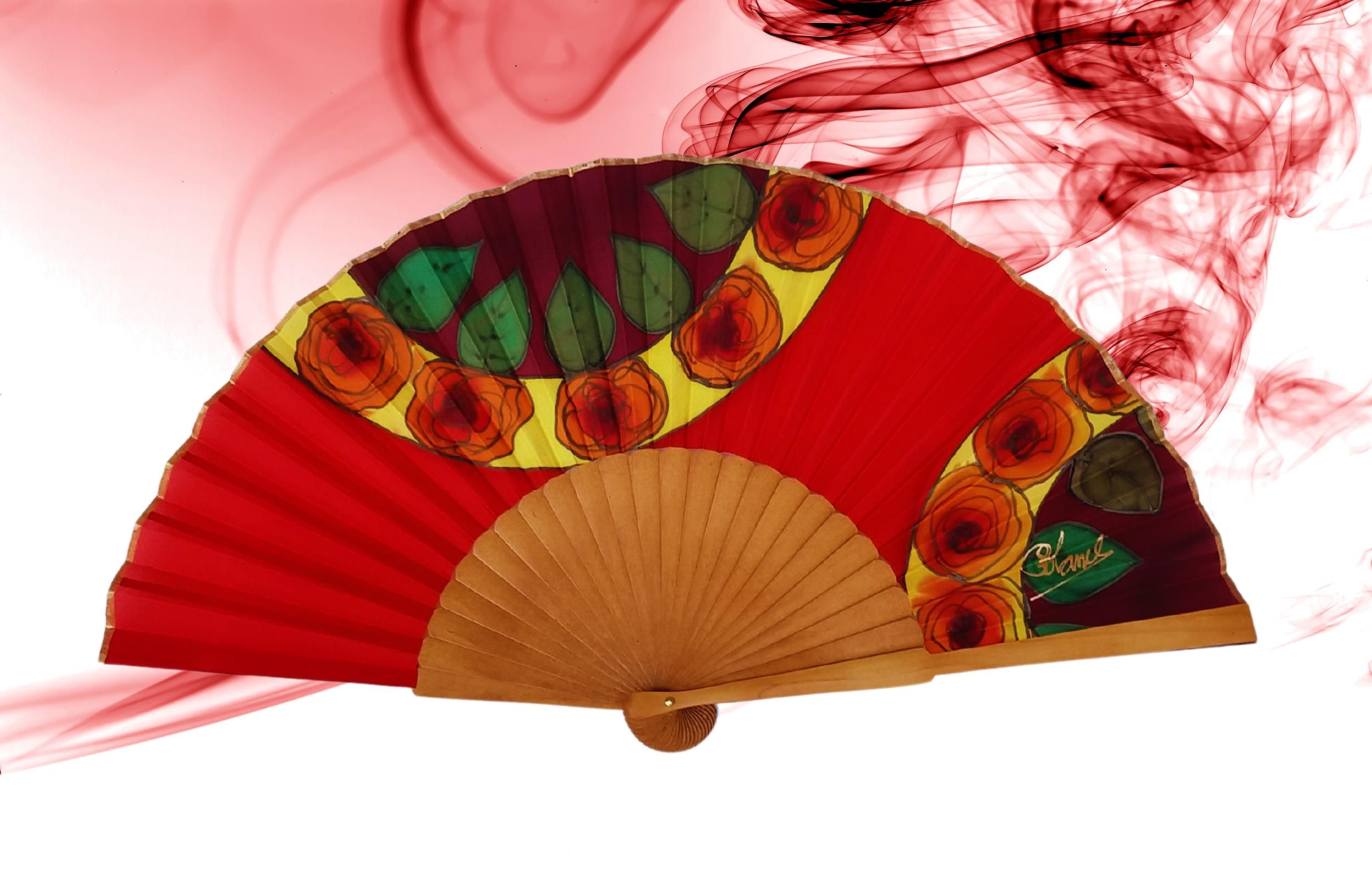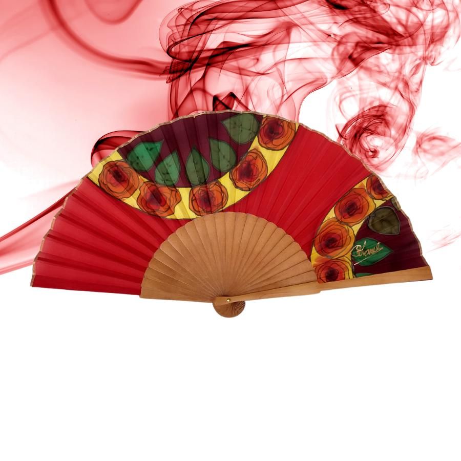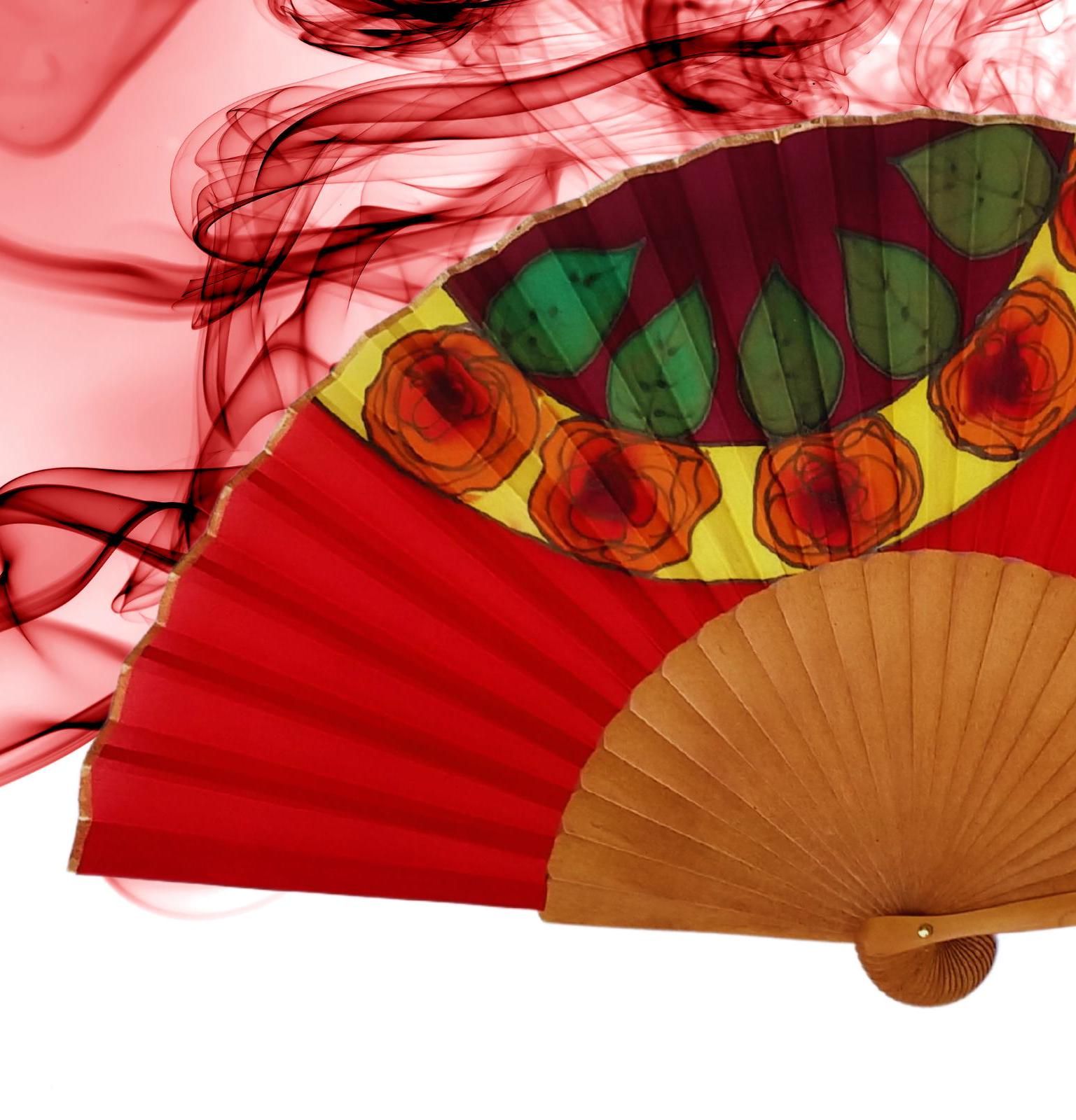 Abanico de seda español pintado a mano: Arte floral rojo pasión