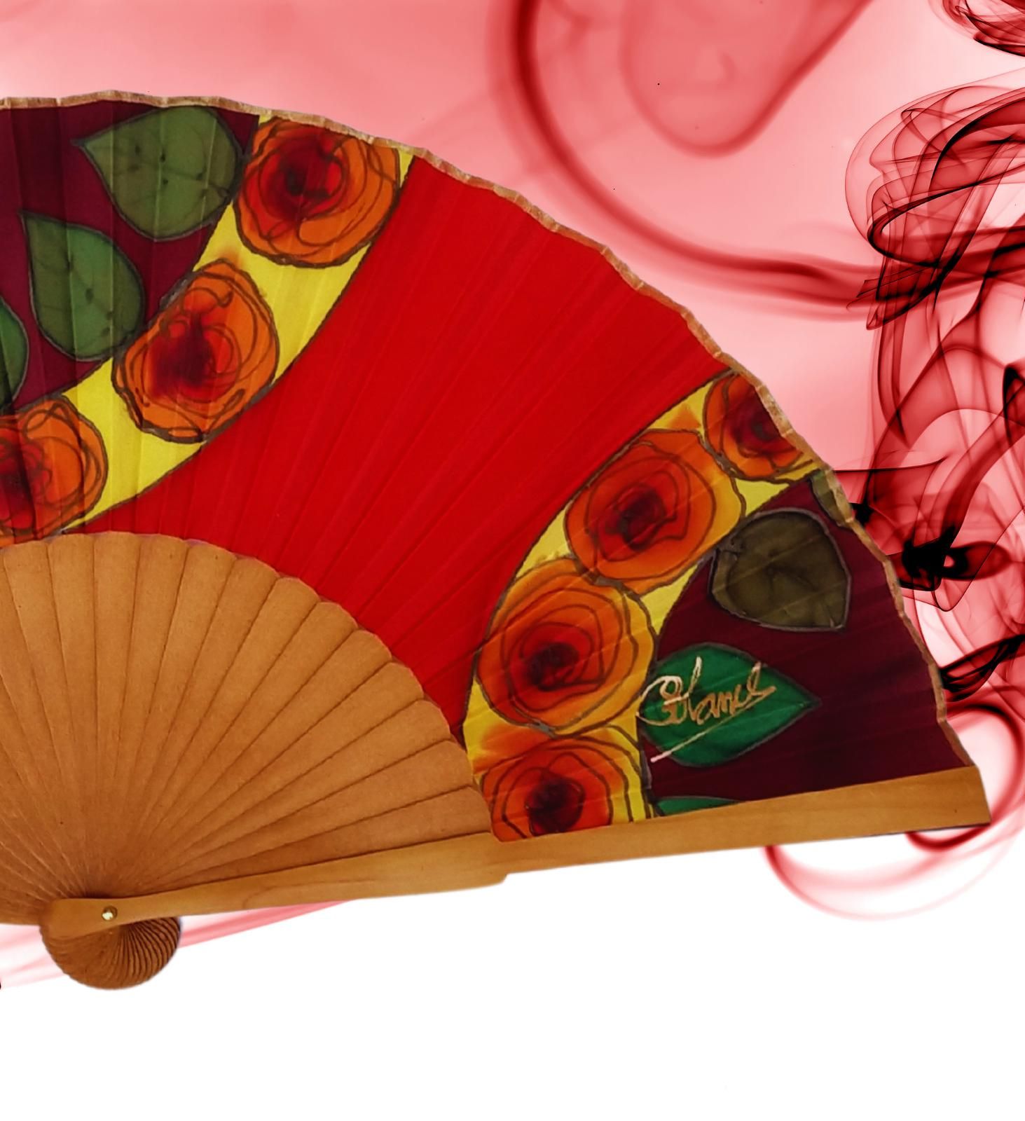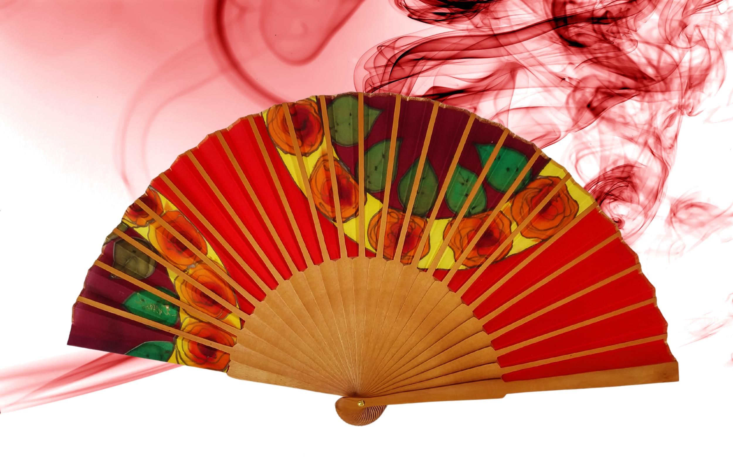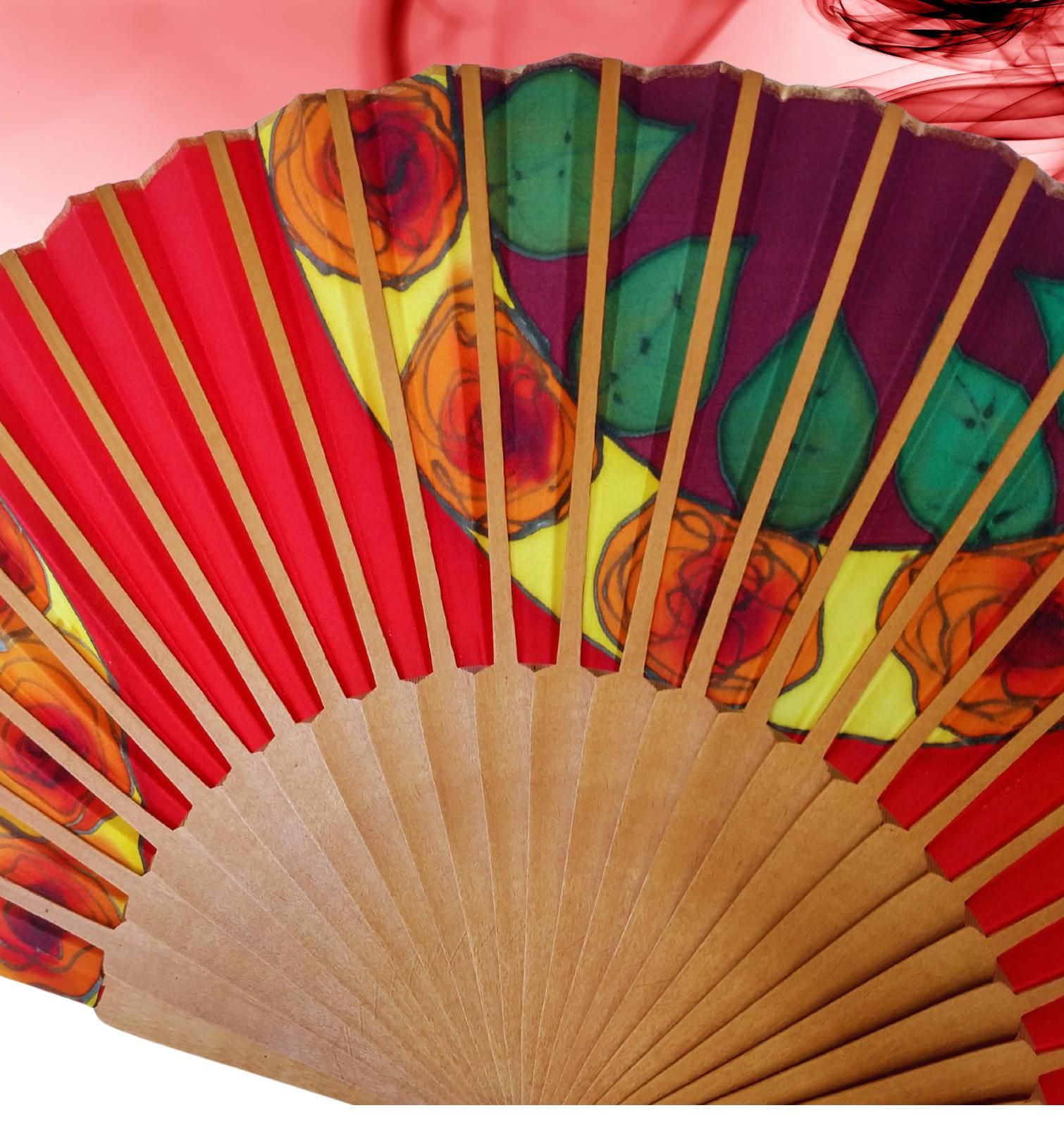 Abanico de seda español pintado a mano: Arte floral rojo pasión