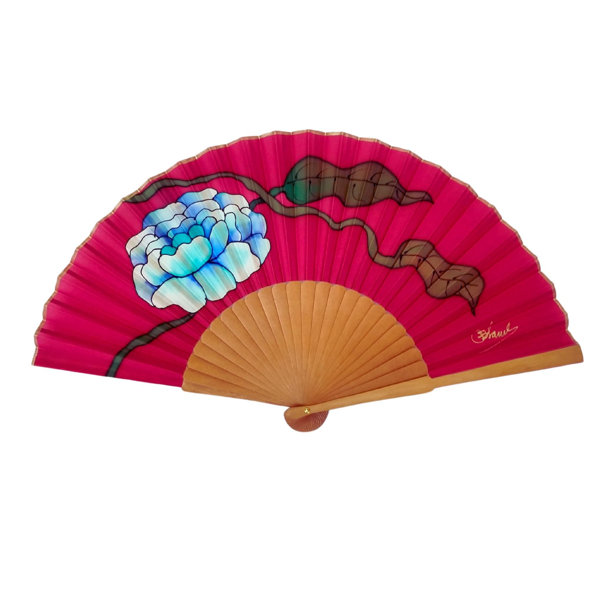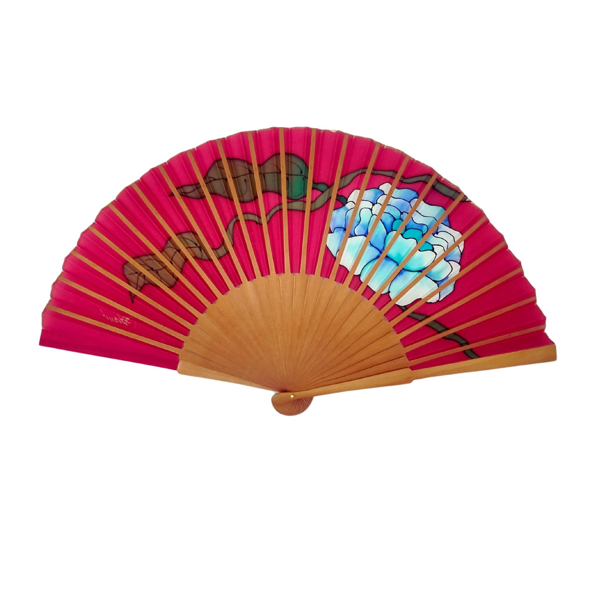 Abanico de seda fucsia con peonía azul – Abanico español de lujo pintado a mano – Regalo elegante para mujer