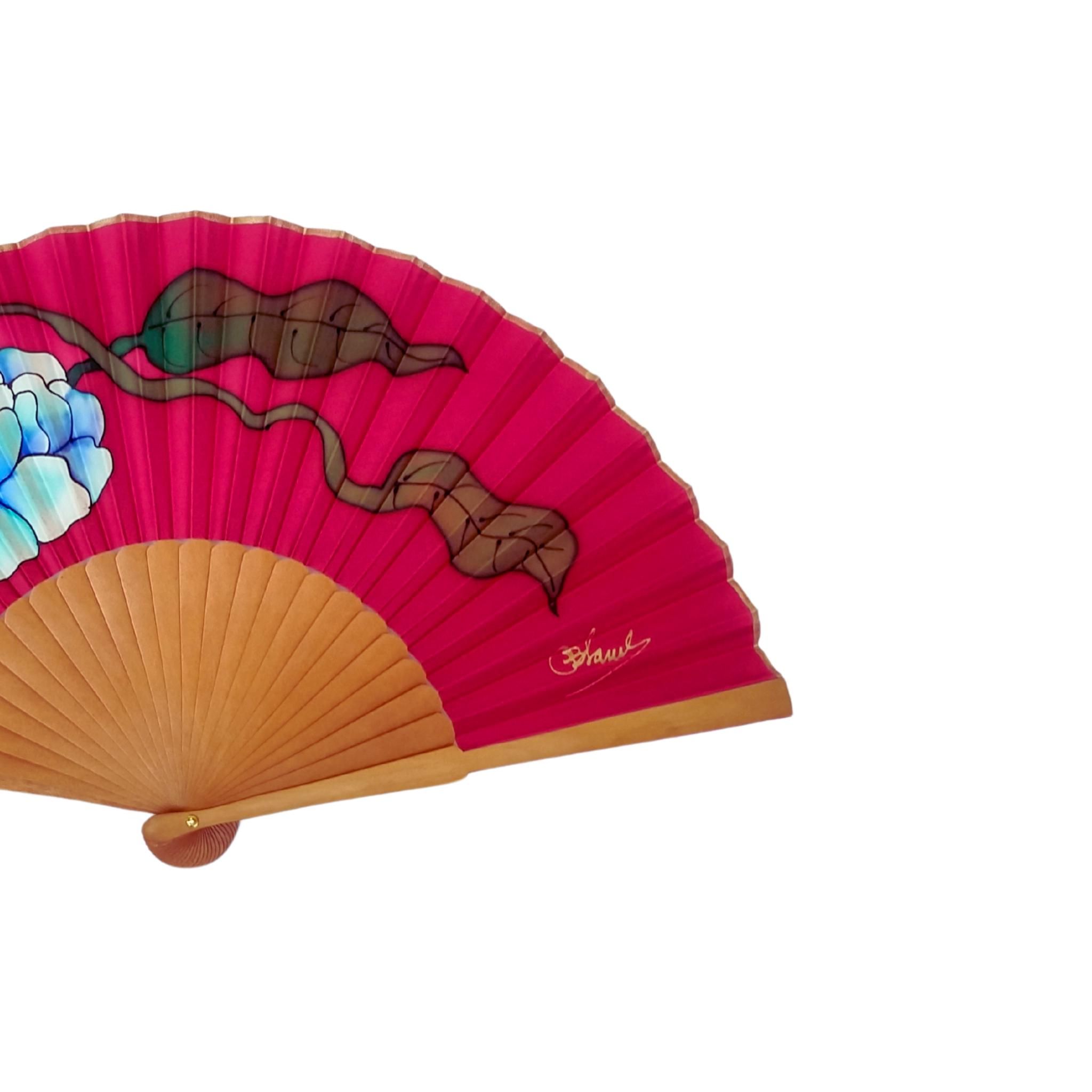 Este abanico plegable de seda pintado a mano es una atrevida declaración de color y sofisticación, con un intenso fondo fucsia, una impresionante peonía azul y delicados detalles de parra marrón. Una combinación única de arte moderno y tradición española, este abanico es perfecto para ocasiones especiales, atuendos elegantes y regalos especiales.