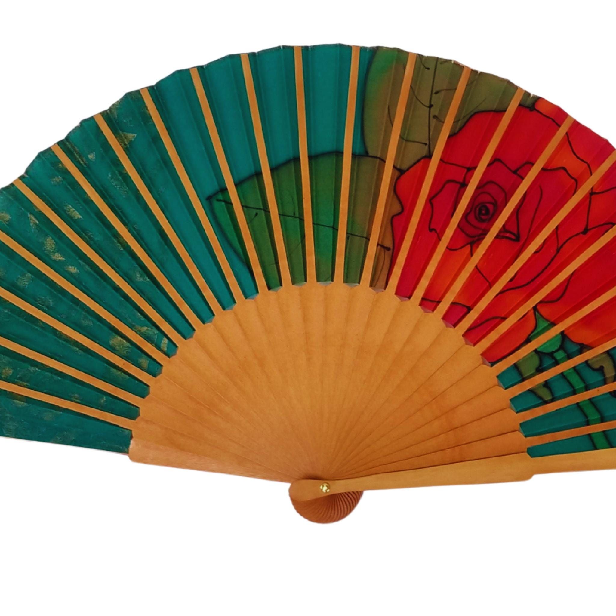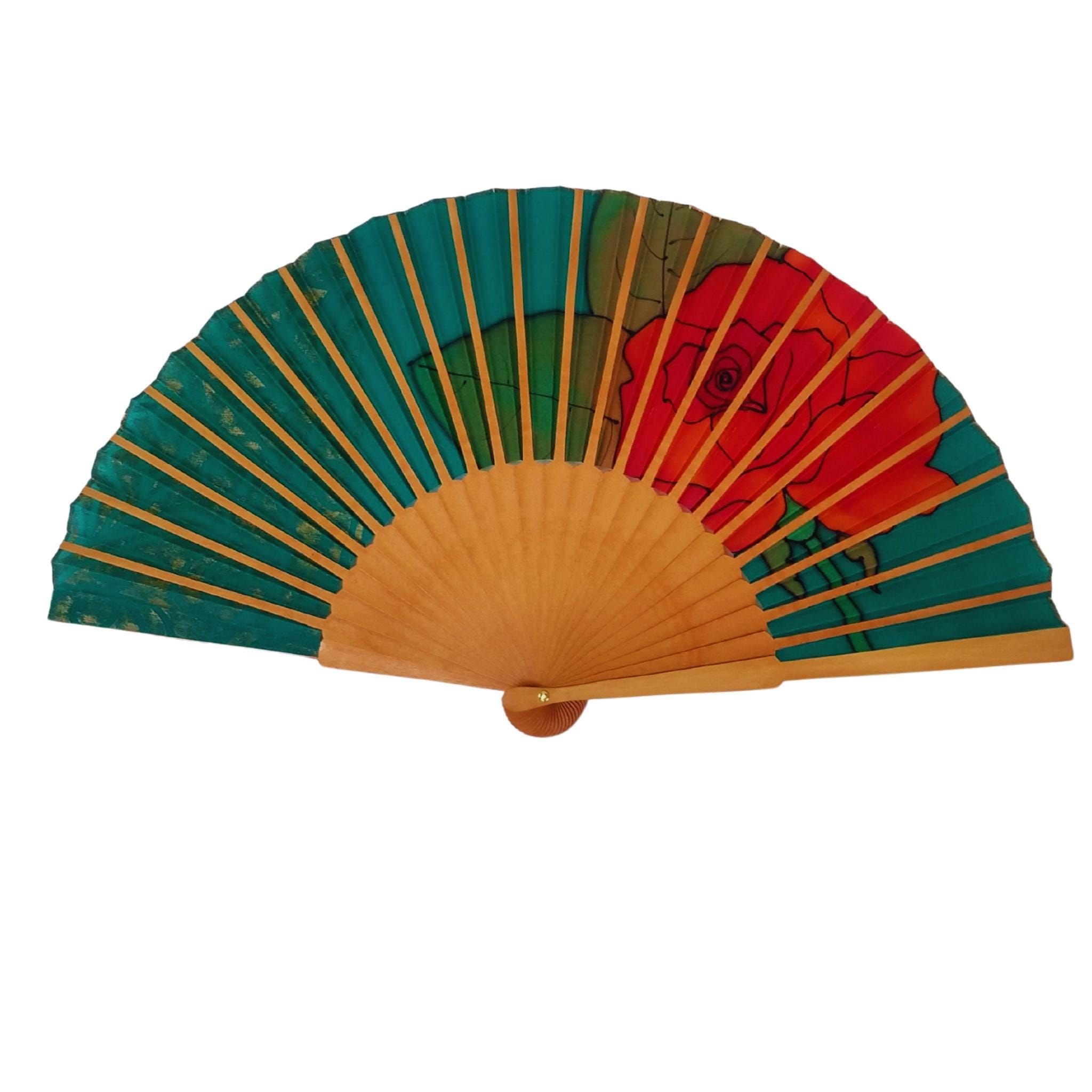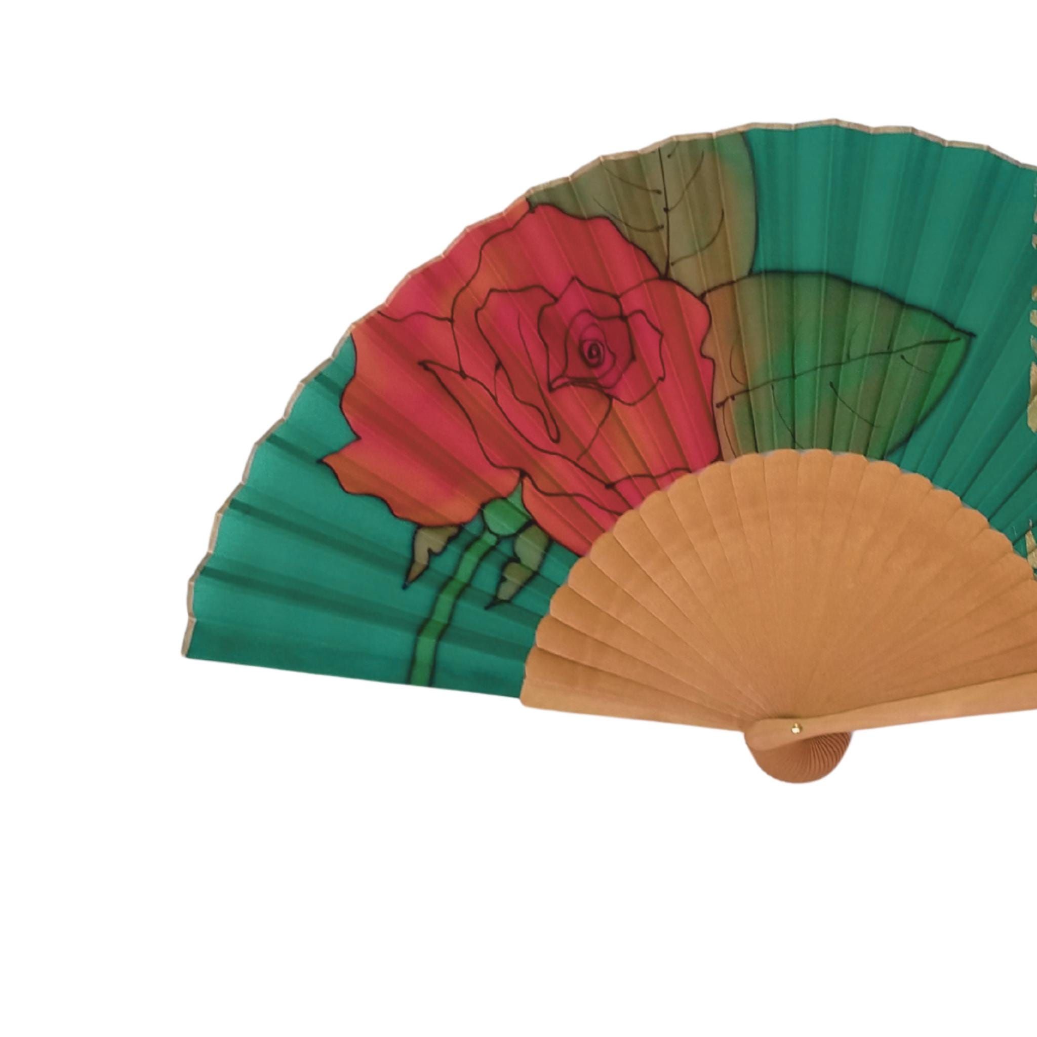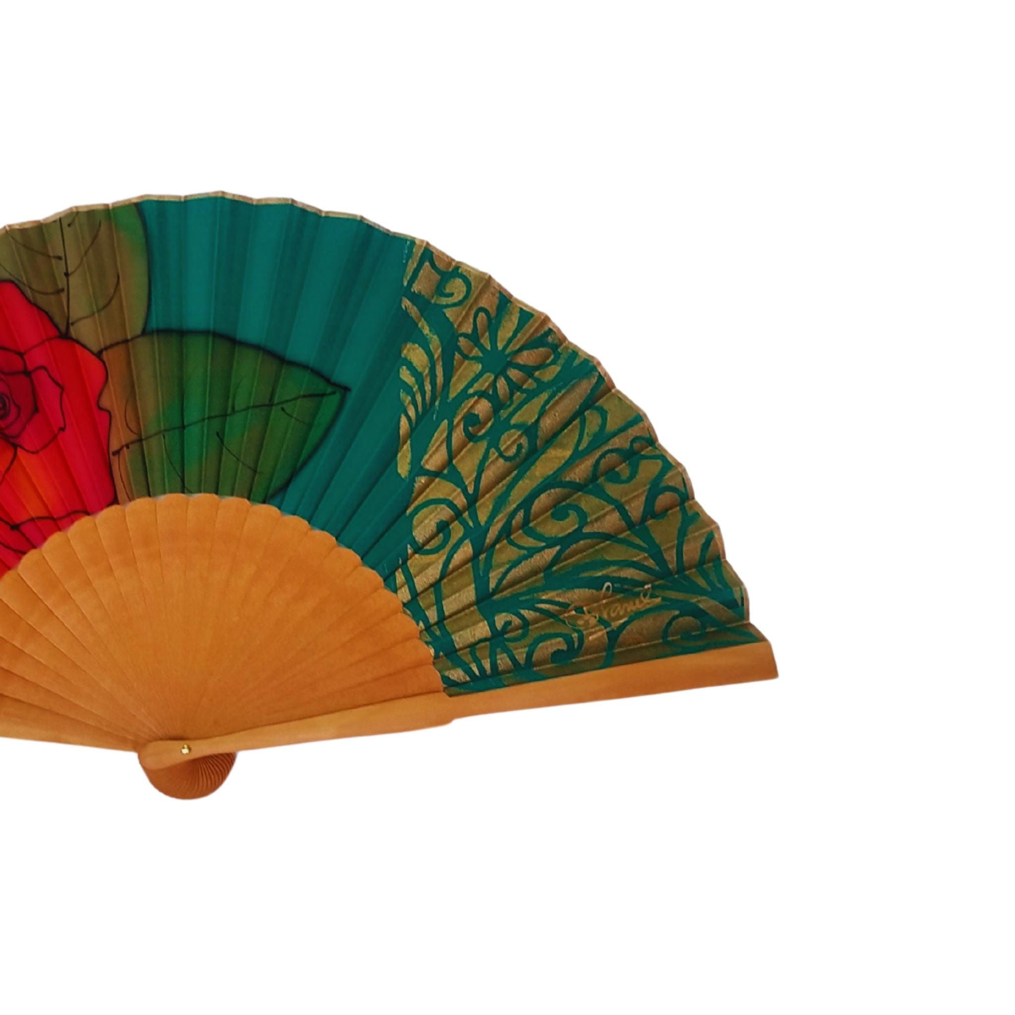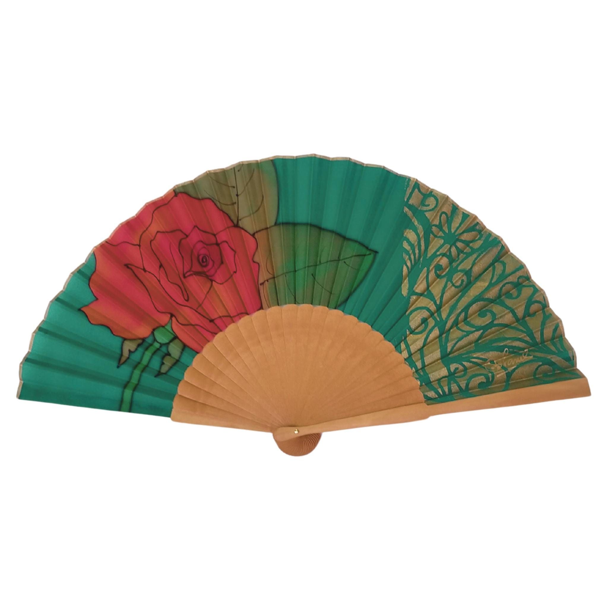 Abanico de seda pintado a mano: verde esmeralda, filigrana dorada y rosa roja