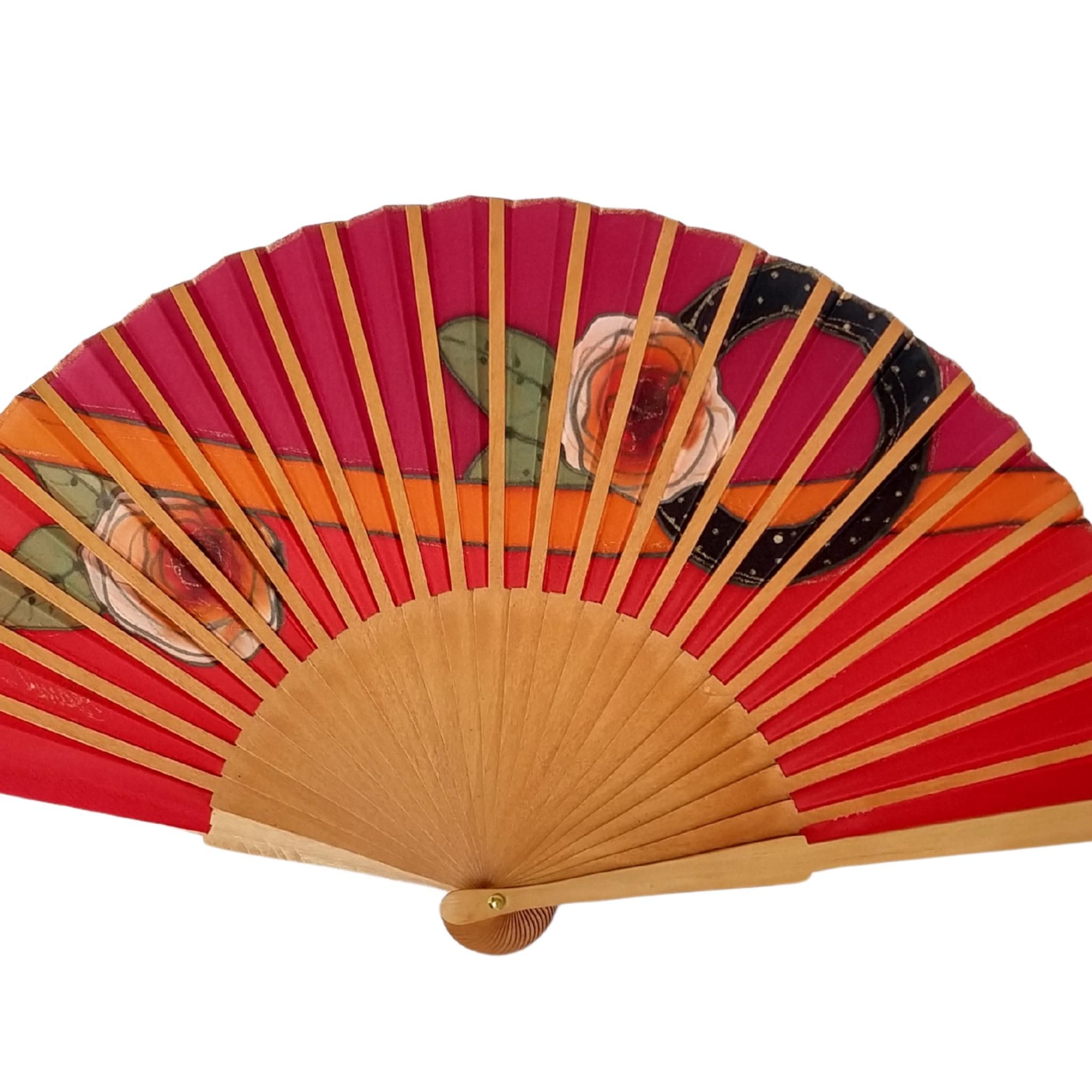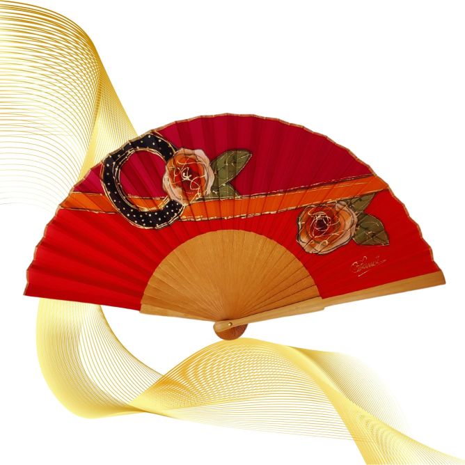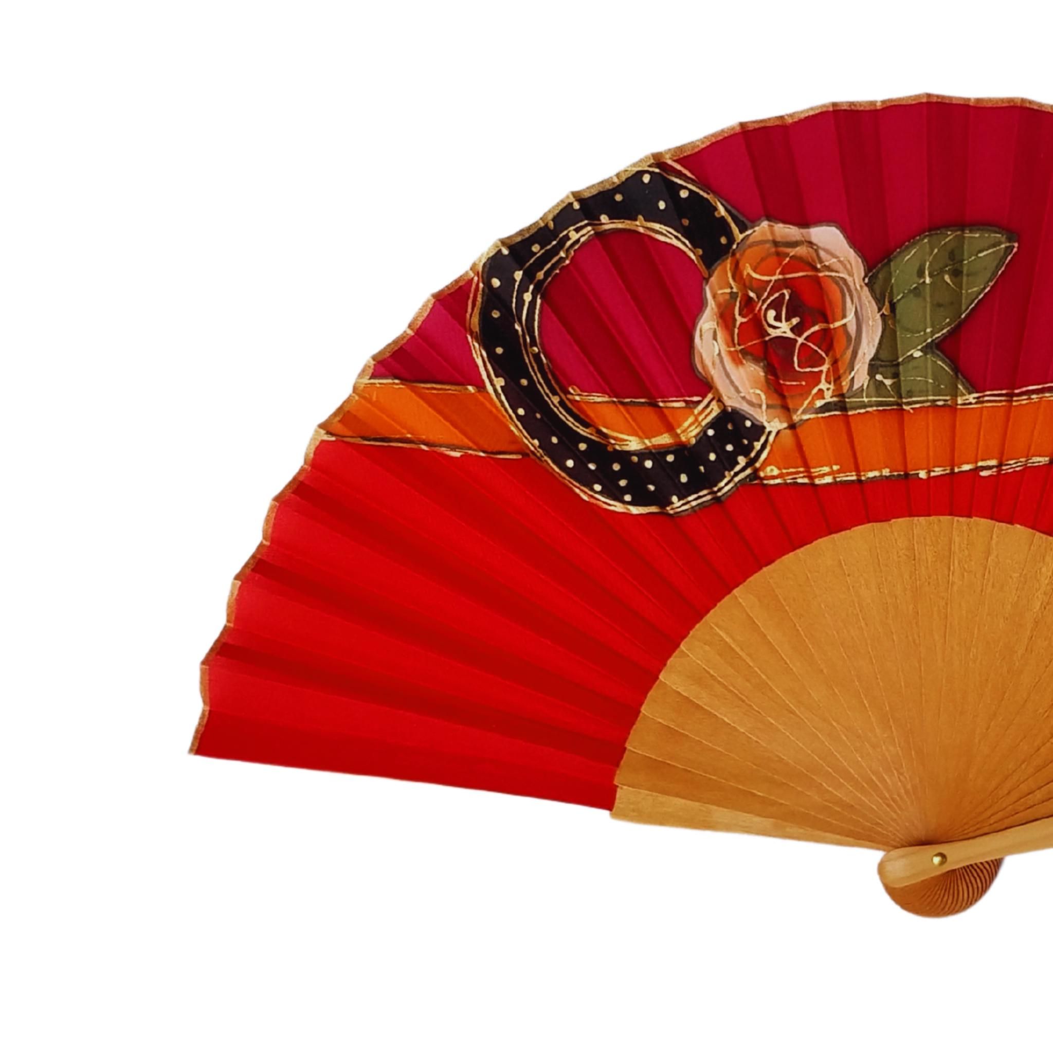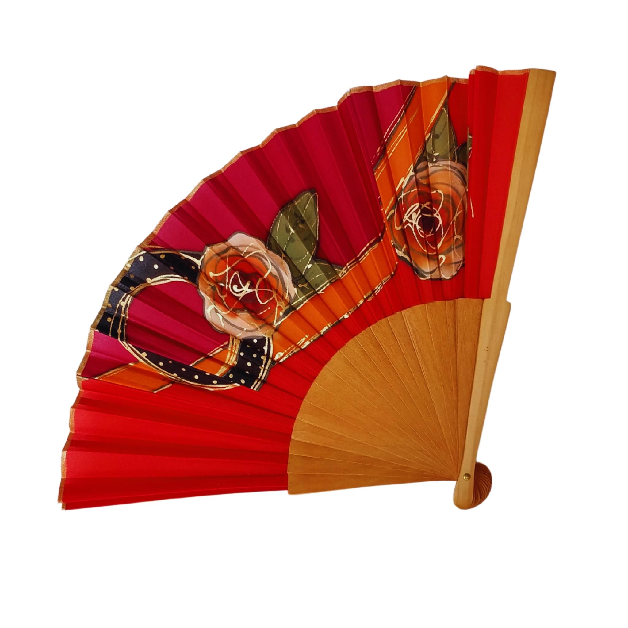 Abanico de seda roja pintado a mano – Abanico plegable español con rosas doradas