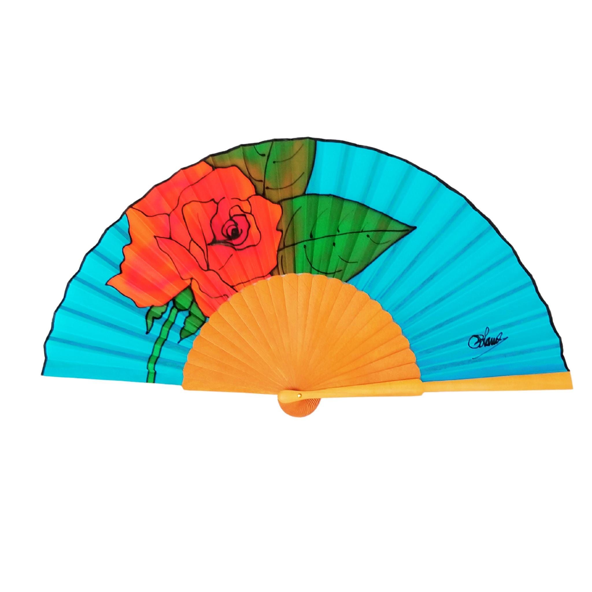 Abanico de seda turquesa pintado a mano – Rosa naranja, accesorio de verano