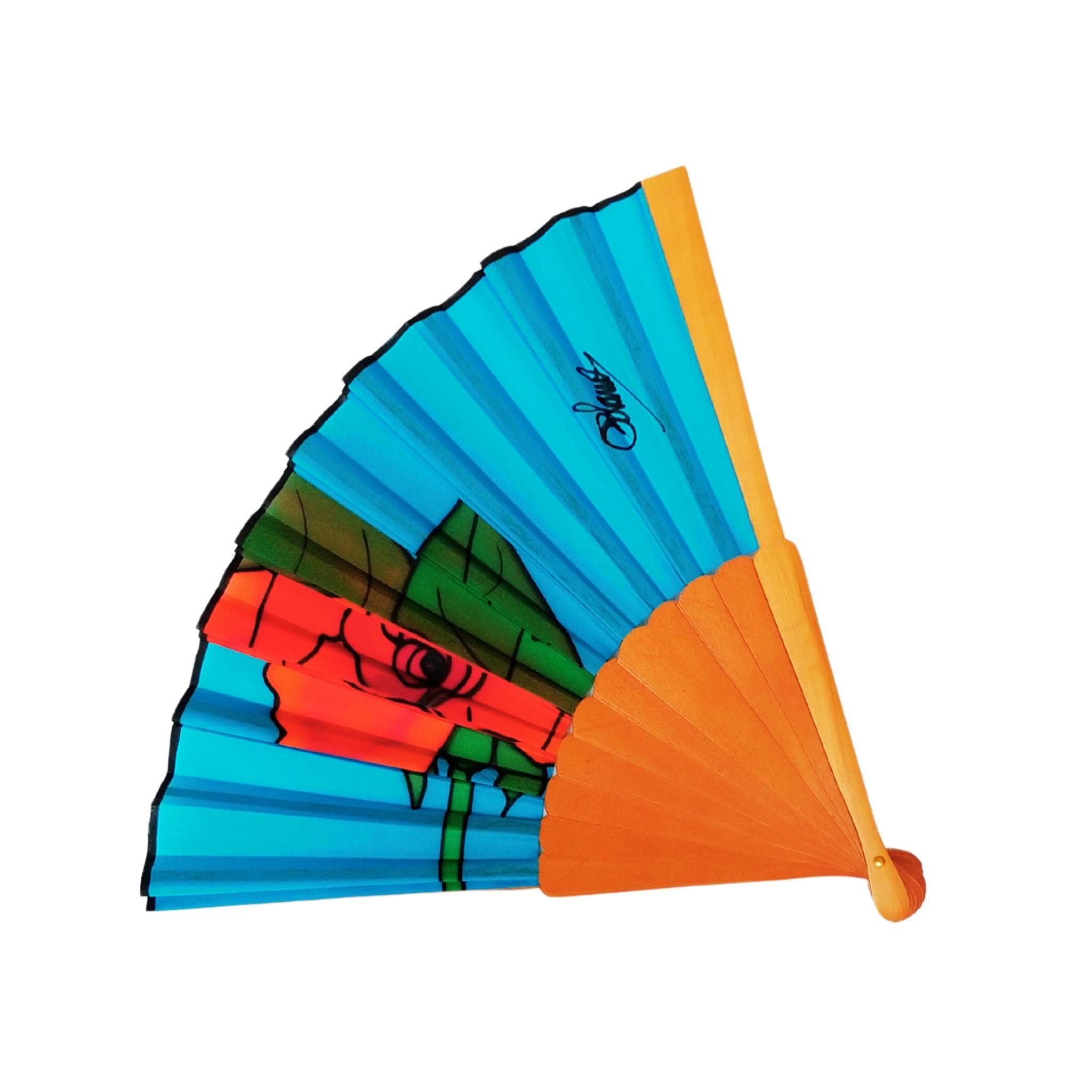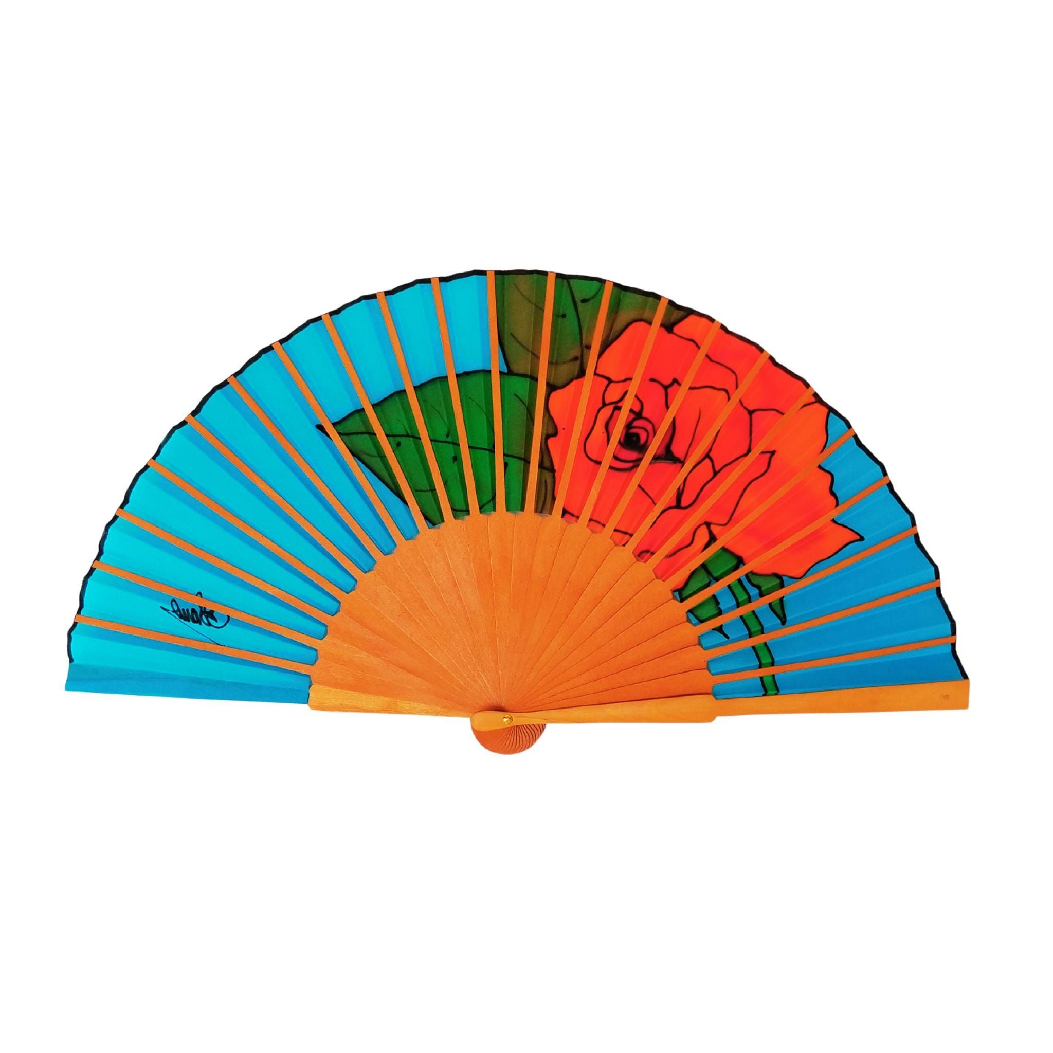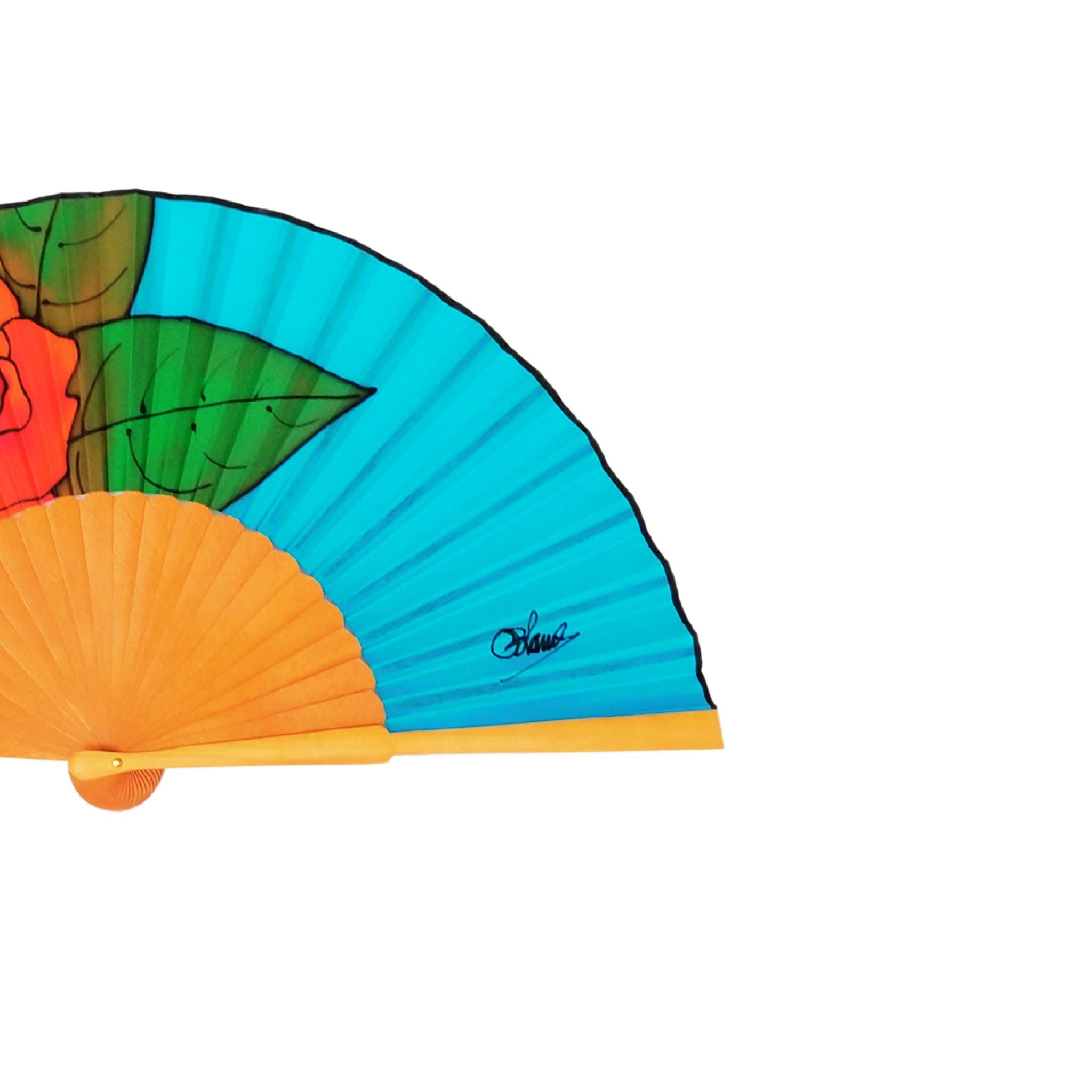 Dale vida a tu estilo con este abanico plegable de seda pintado a mano, que luce una llamativa rosa naranja con exuberantes hojas verdes sobre un vibrante fondo turquesa. Este abanico combina la tradición artesanal española con colores modernos y vibrantes, convirtiéndolo en el accesorio perfecto para eventos de verano, salidas informales o como un regalo original.