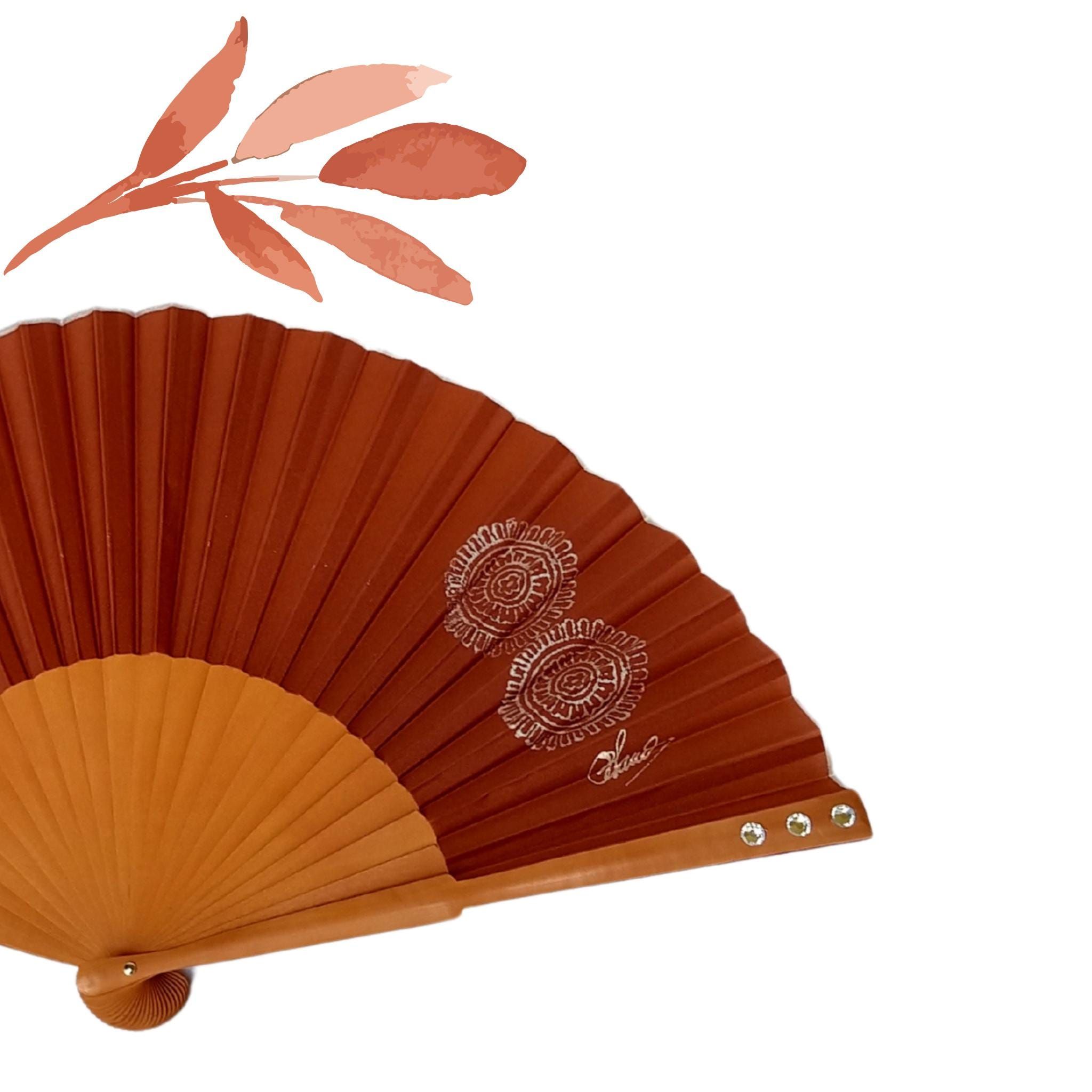 Abanico plegable de seda color terracota: elegante abanico pintado a mano con pedrería