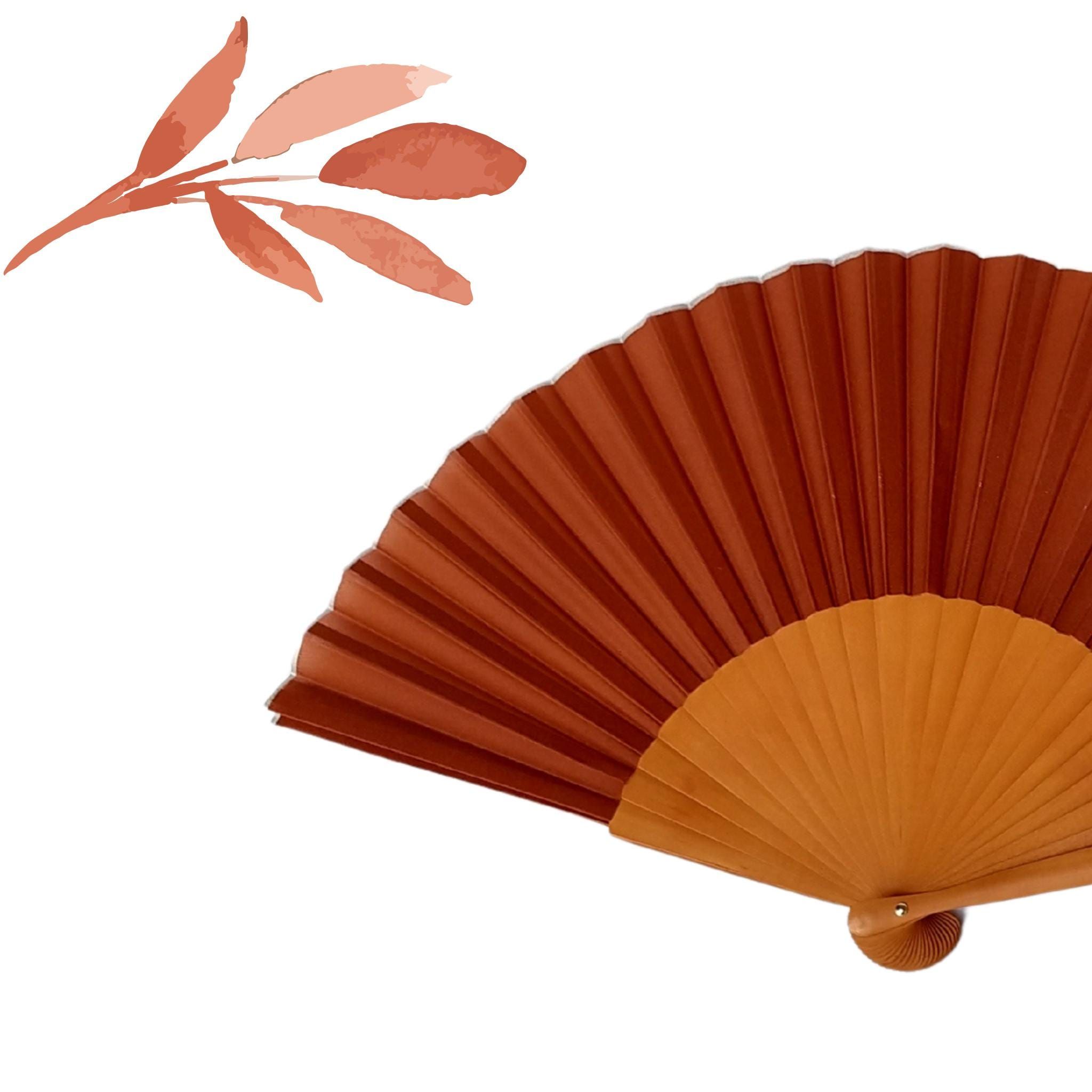 Este abanico plegable de seda color terracota es una lujosa pieza que combina la tradición atemporal con la elegancia moderna.