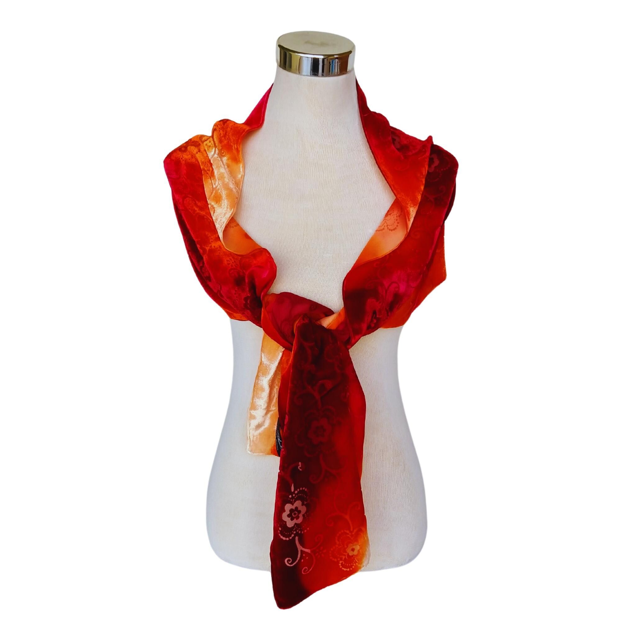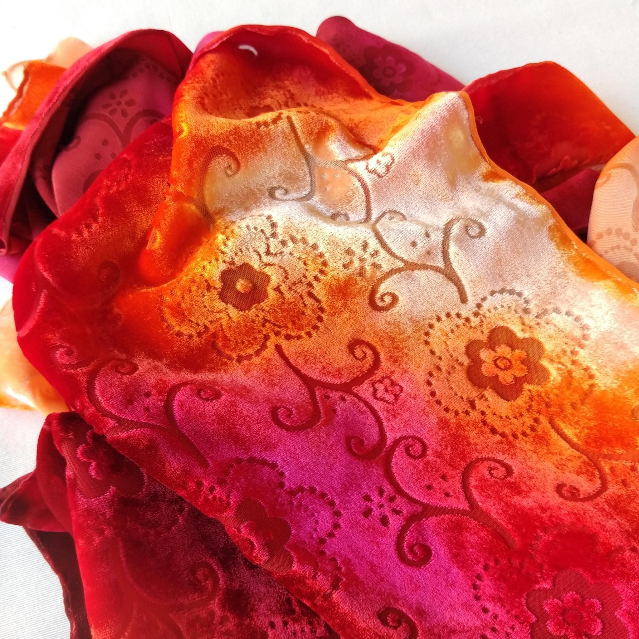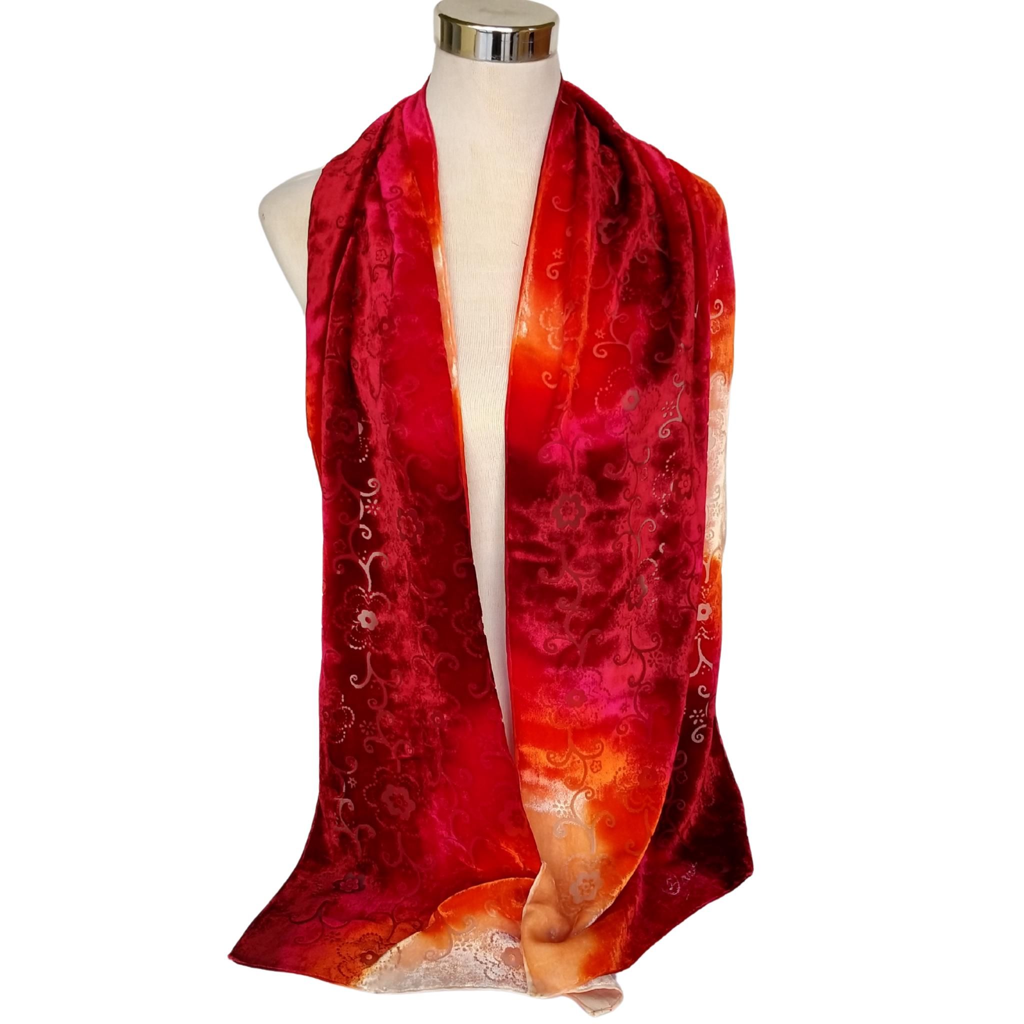 Bufanda de terciopelo de seda roja desgastada: chal floral teñido a mano