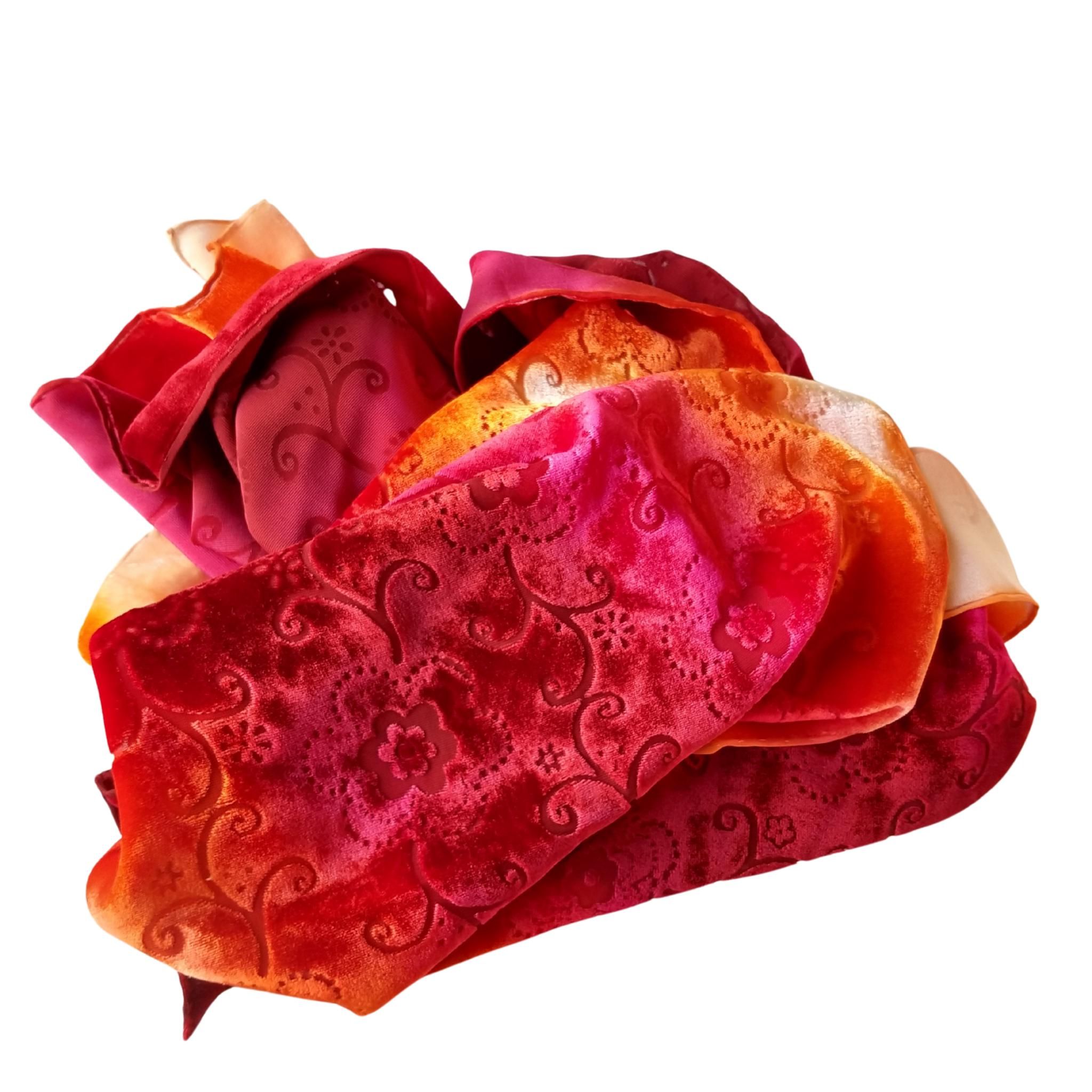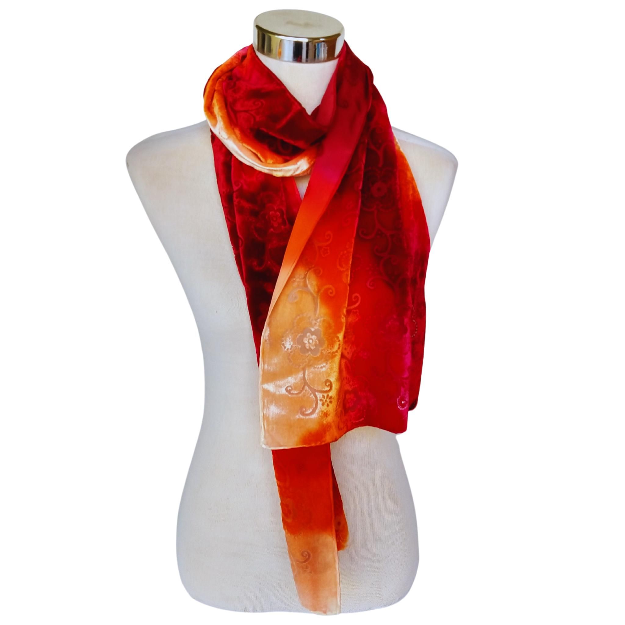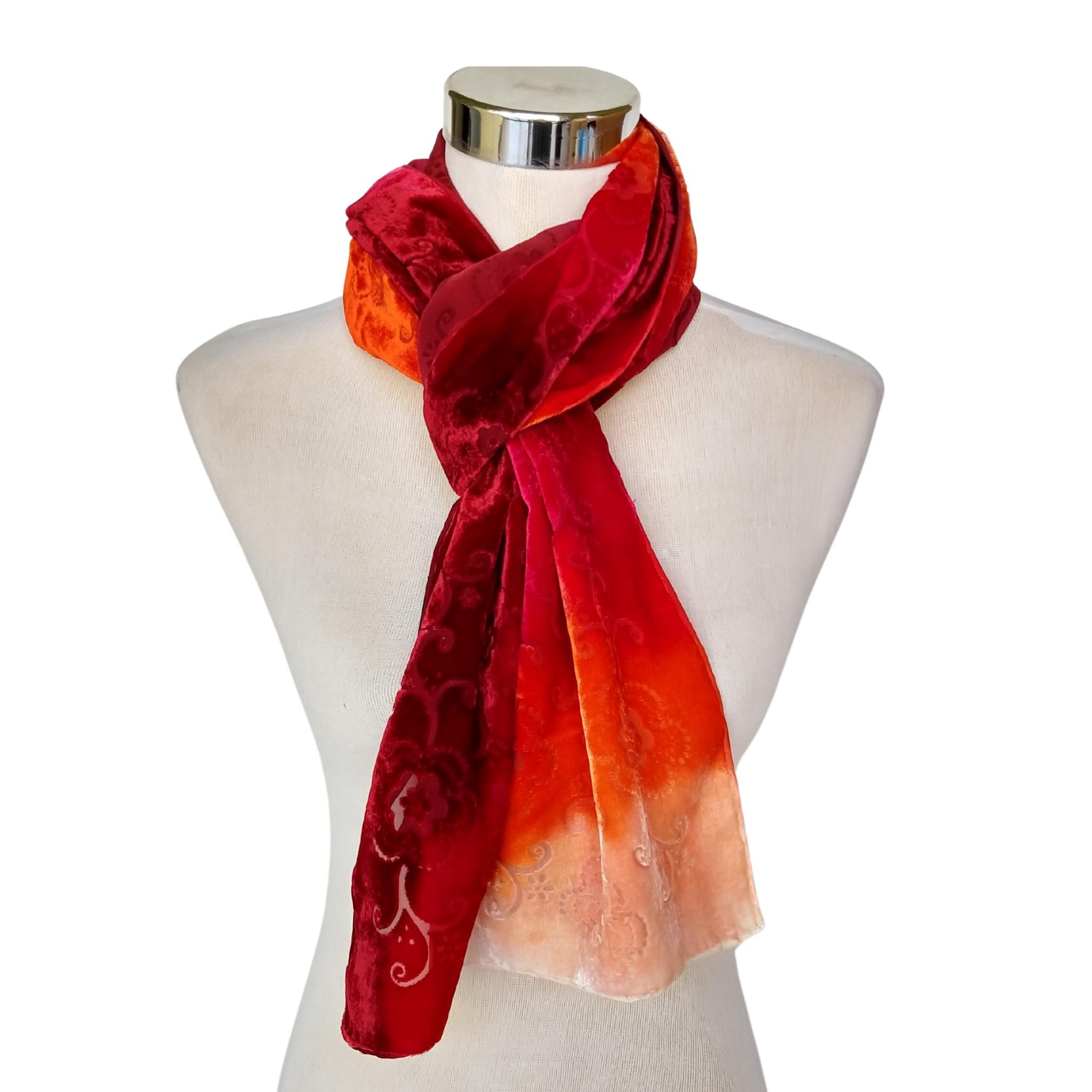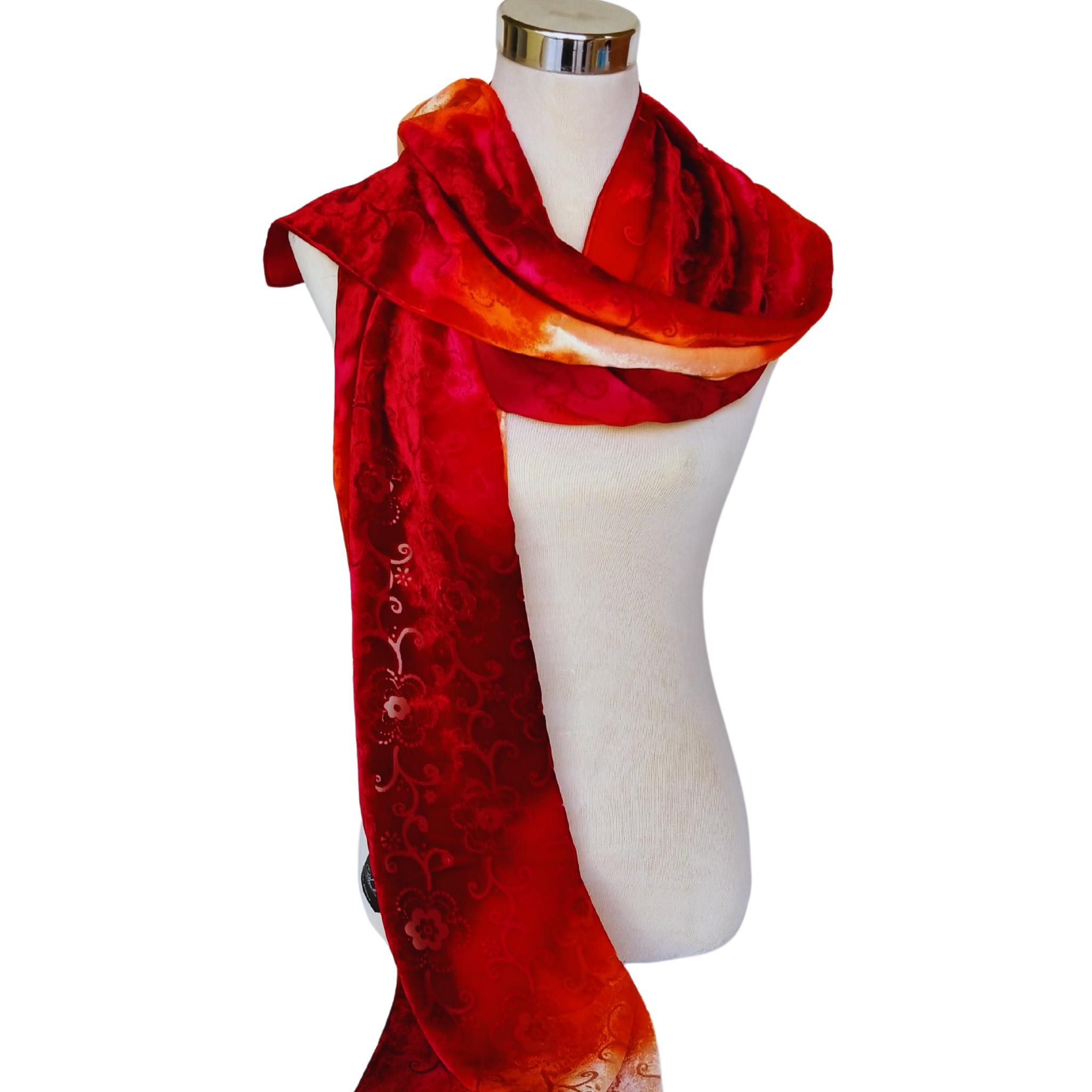 Bufanda de terciopelo de seda roja desgastada: chal floral teñido a mano