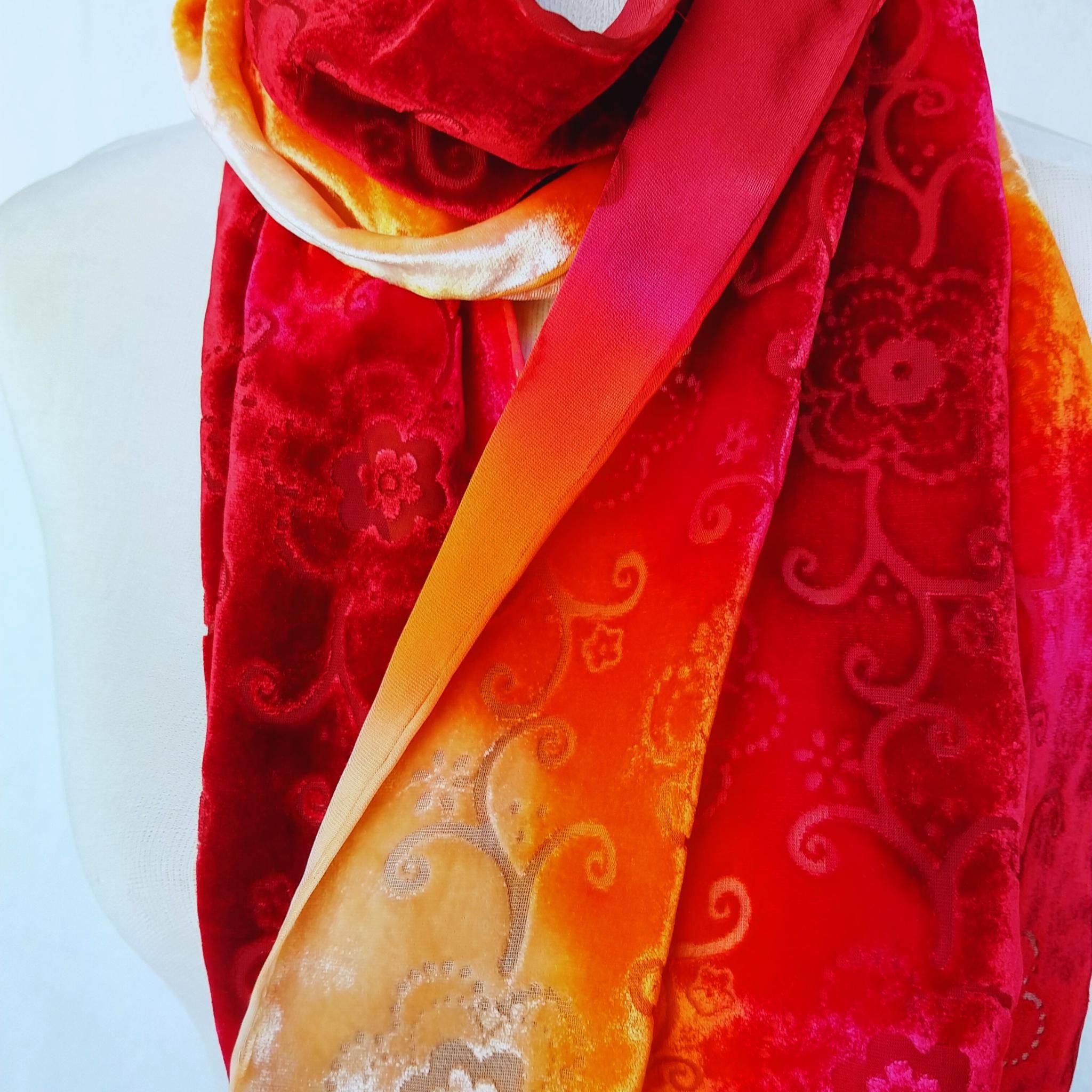 Realza tu estilo con este exquisito chal de terciopelo y seda en tonos carmesí intenso y atardecer. Elaborado en seda devoré (terciopelo quemado) y pintado a mano, este chal combina una elegancia atemporal con una belleza suntuosa y táctil. Su textura exuberante y sus tonos luminosos lo convierten en la pieza perfecta para bodas, eventos nocturnos o un estilo refinado para el día a día.