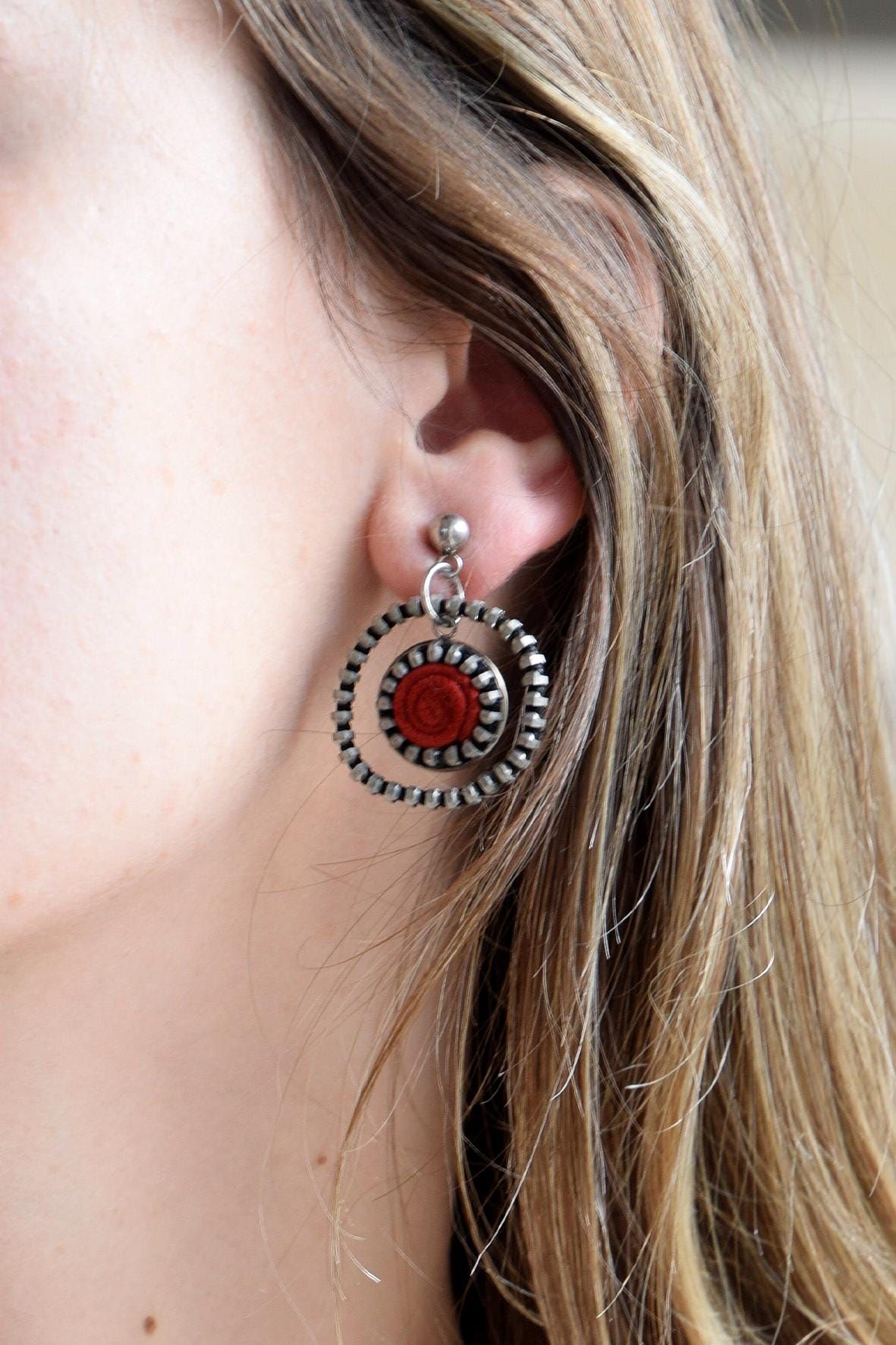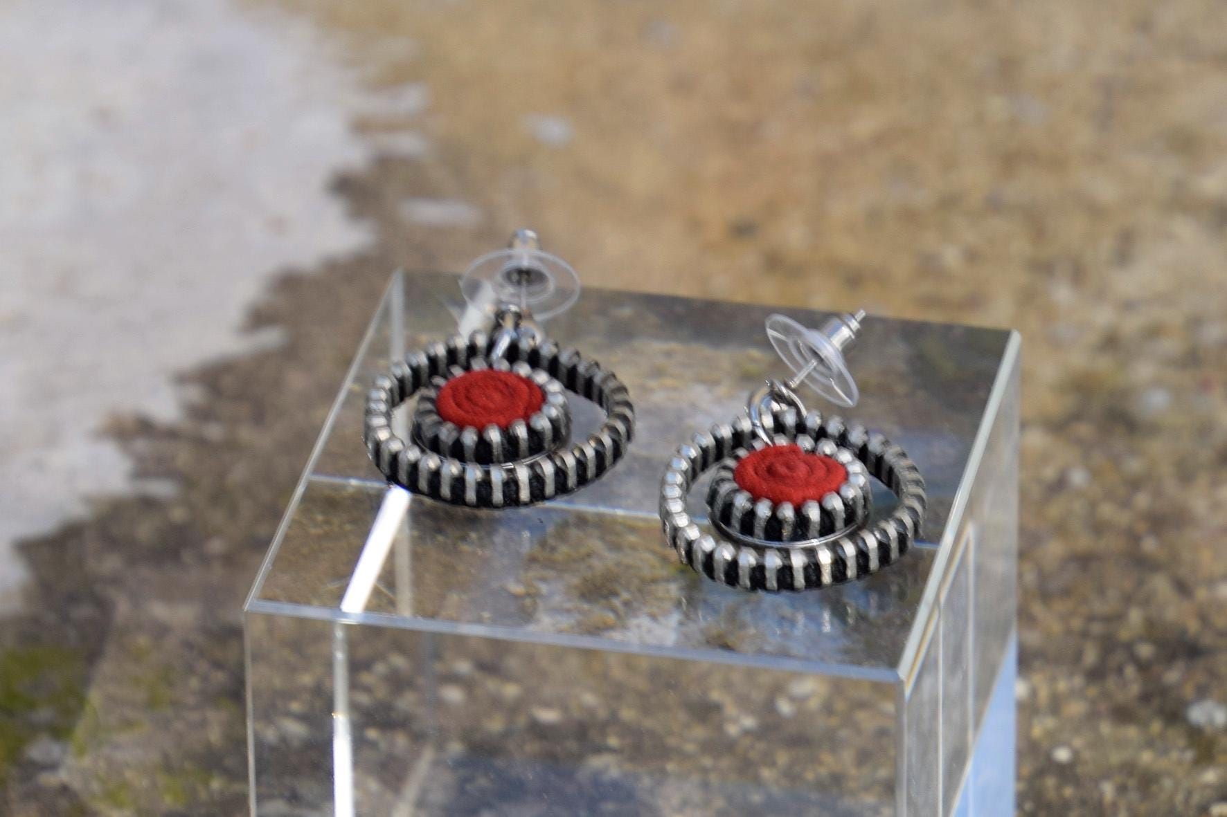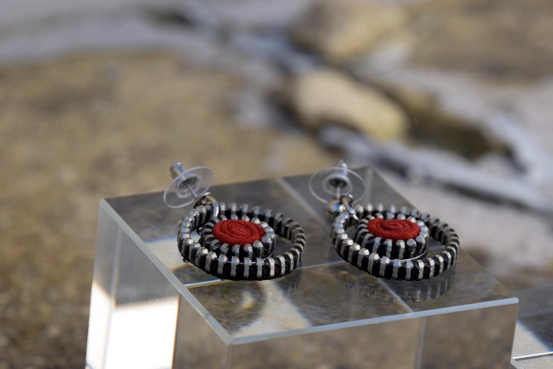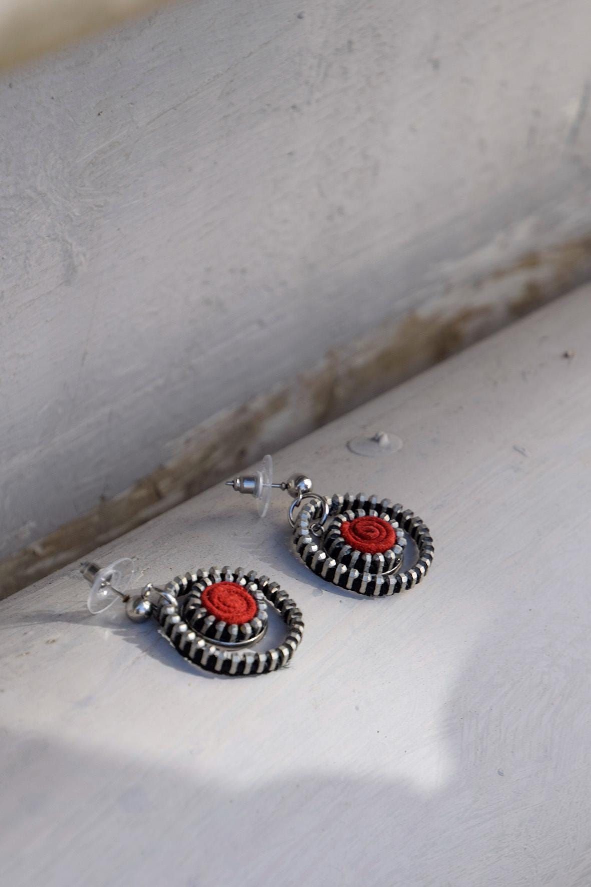 Pendientes de aro hechos con un aro de cremallera y una pieza roja de serraje reciclado.
